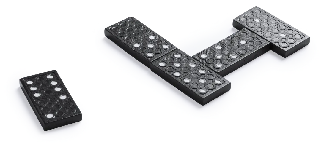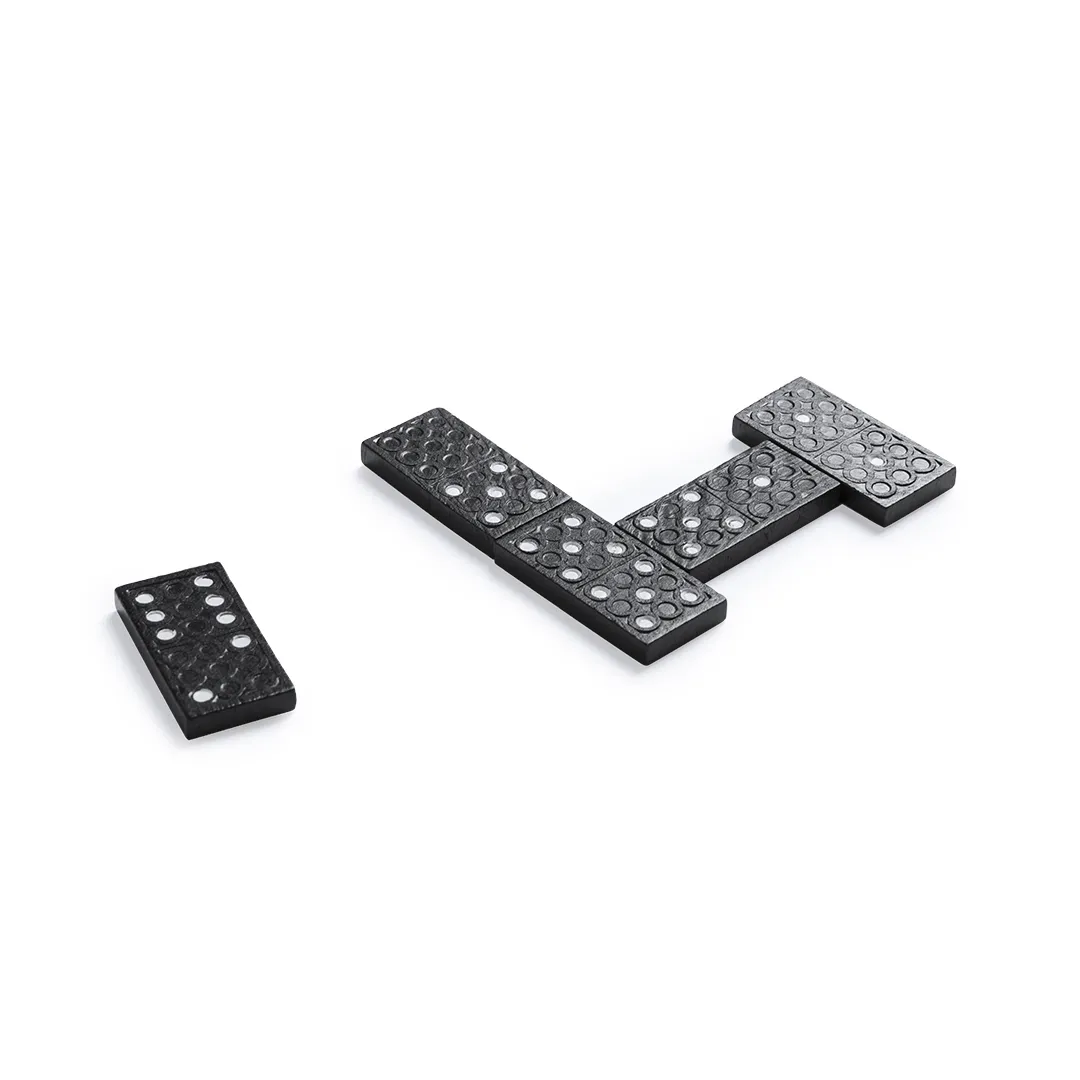 Dominó clásico de 28 piezas fabricado en madera. Piezas en sobrio diseño de color negro con detalle en blanco. Presentado en estuche individual de madera con tapa.
