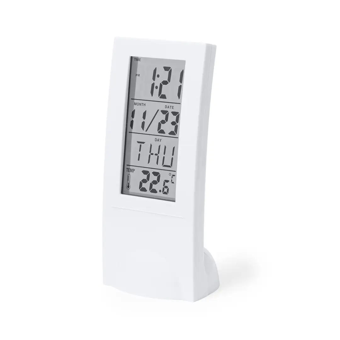 Estación meteorológica fabricada en resistente ABS, con sensor de temperatura. Función de hora (12/24), calendario, alarma y día de la semana. Con base soporte y botones de control traseros. Alimentación a pilas (2xAAA no incluidas) y presentada en atractiva caja de diseño kraft. Disponible manual de instrucciones en español e inglés.