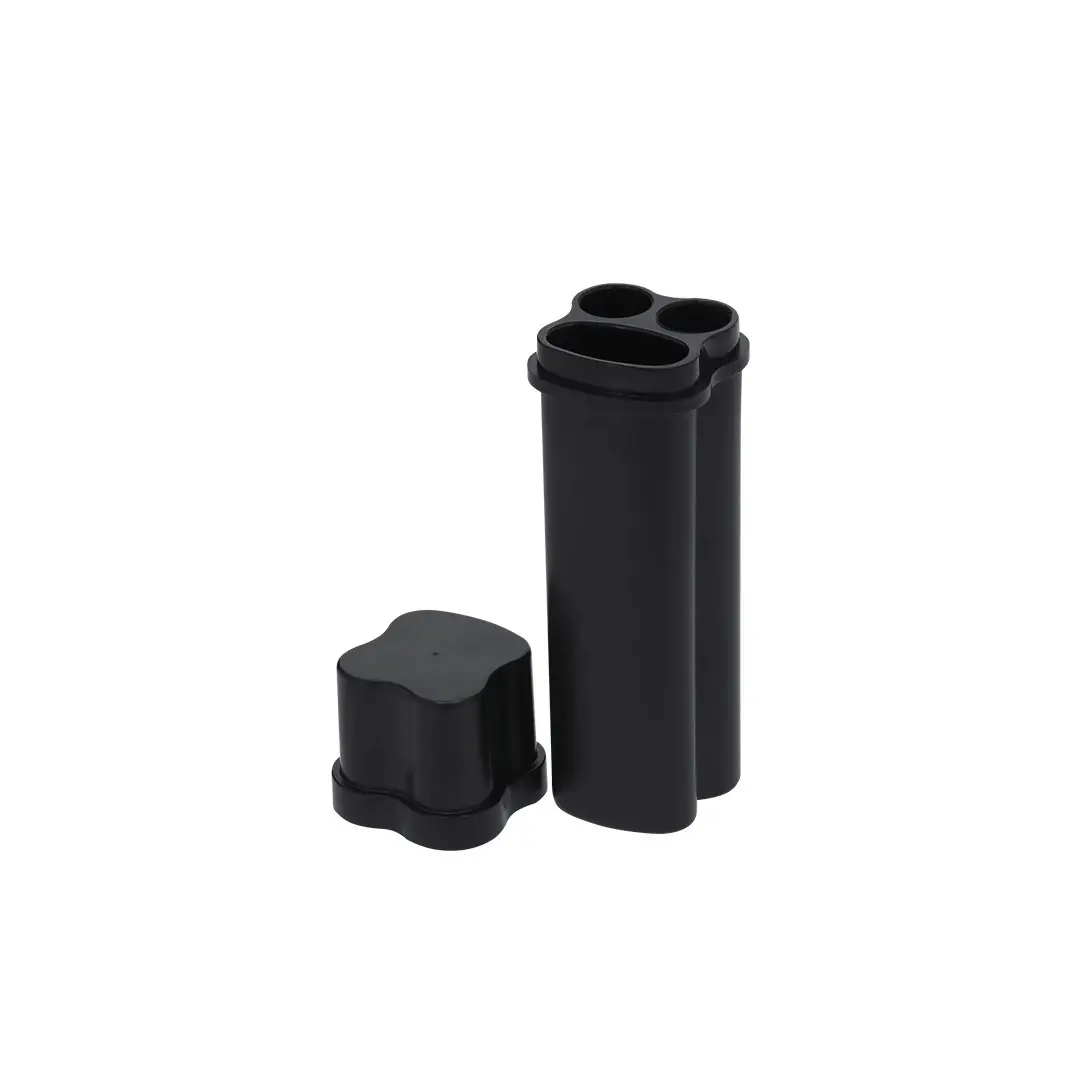 Práctico estuche para tabaco de diseño compacto y longitud especial, ideal para transporte. Capacidad para dos cigarros y un mechero. Con tapadera con bisagra.