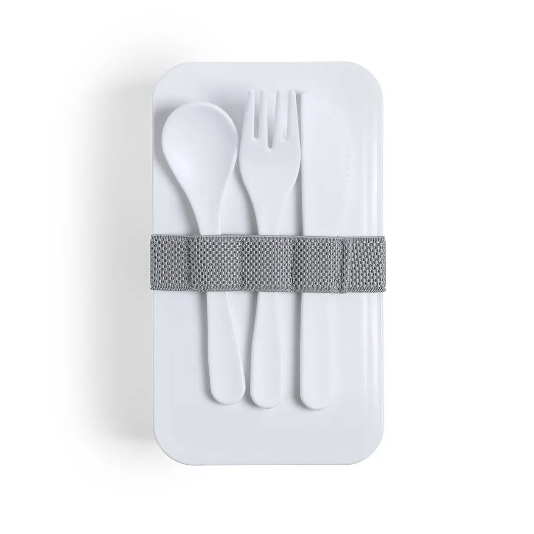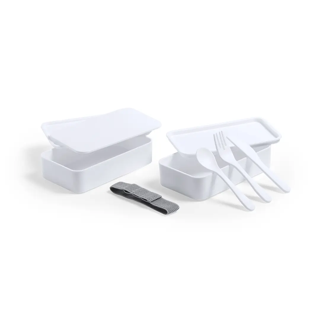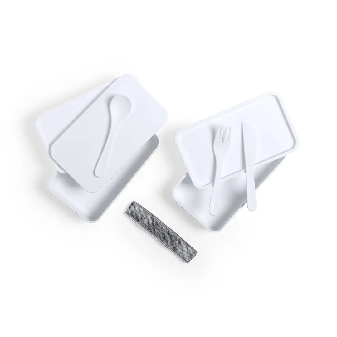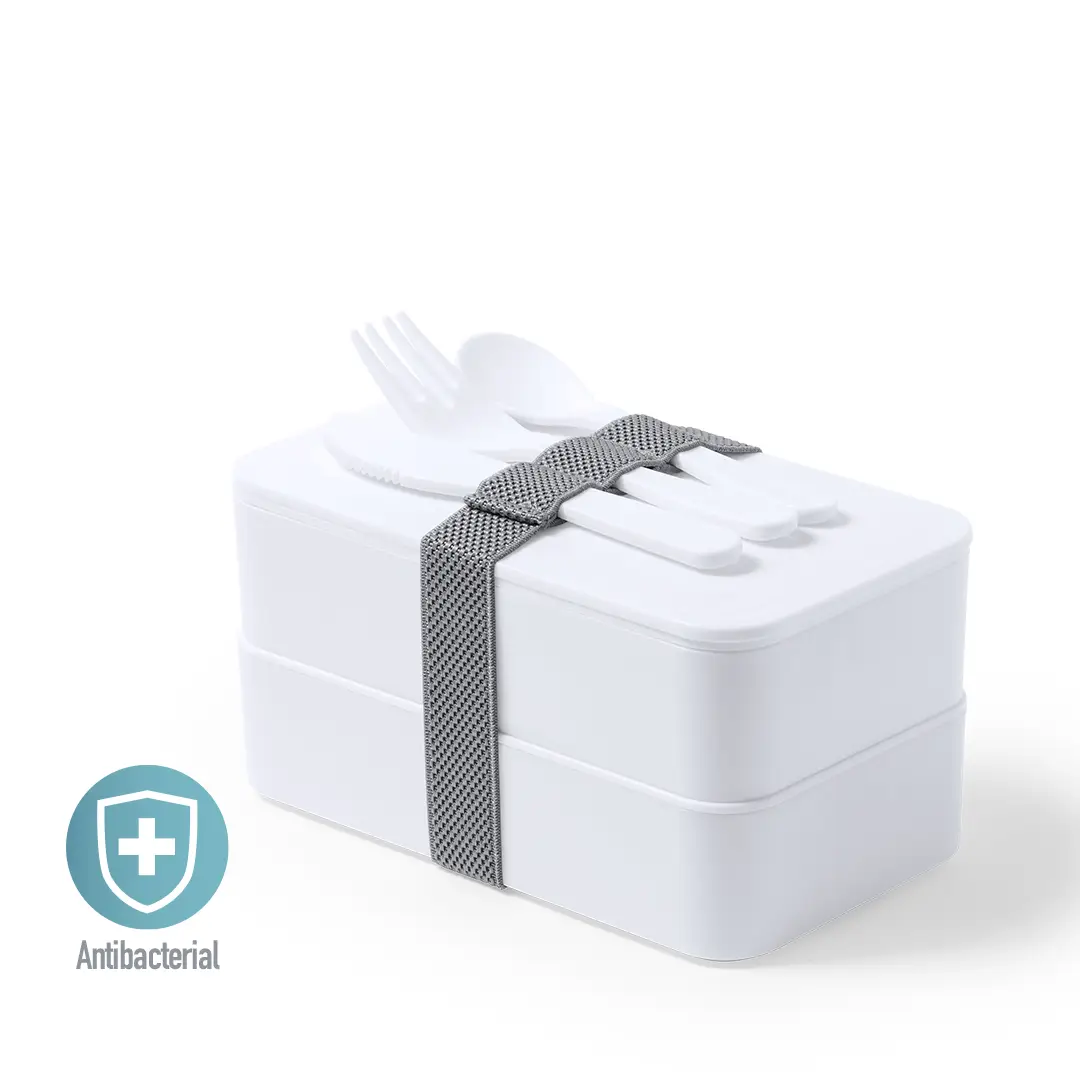 Fiambrera antibacteriana en resistente material PP de acabado sólido, libre de BPA. Dos compartimentos, cada uno de 700 ml de capacidad y cinta de seguridad con tenedor, cuchara y cuchillo. Los productos con tratamientos antibacterianos son capaces de reducir drásticamente las cargas bacterianas presentes en las superficies de los materiales, gracias a la incorporación de agentes microbianos permanentes estáticos, con alta efectividad para inhibir y prevenir la contaminación bacteriana. Artículo de acuerdo al estándar ISO 22196, que determina la actividad antibacteriana en materiales plásticos y superficies no porosas, lo que permite conocer la efectividad de inhibición microbiana que tienen los aditivos sobre los objetos tratados mediante una evaluación cuantitativa.