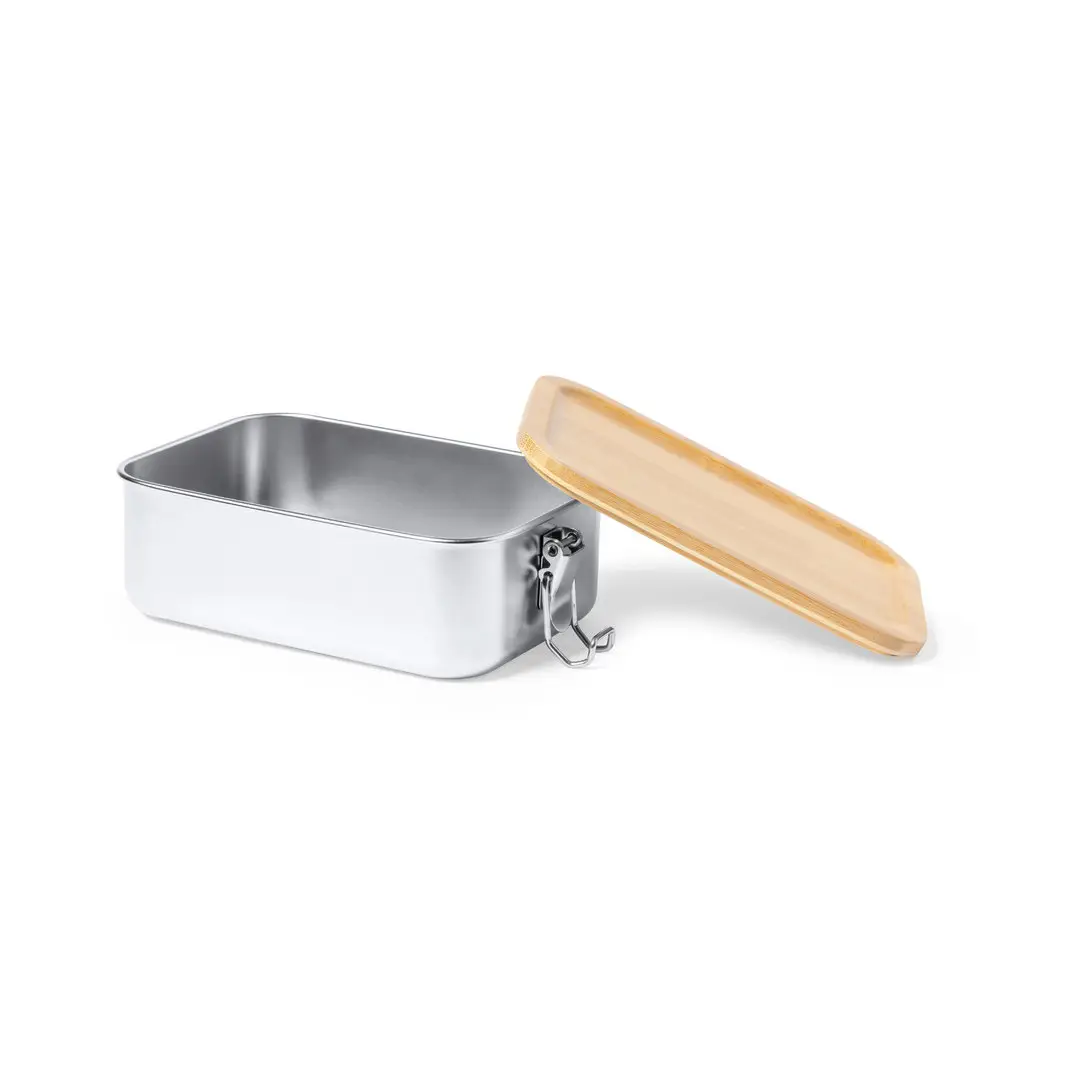 Fiambrera de 800 ml de capacidad, fabricada en acero inox. Con tapa hermética en bambú y libre de BPA. Presentada en caja individual de diseño kraft.
