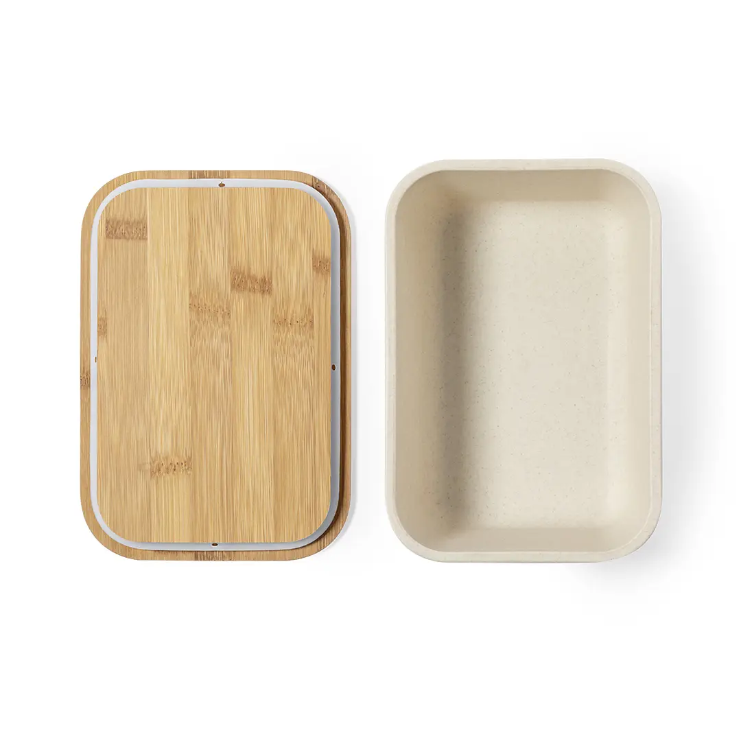 Fiambrera de 1l en resistente material PP veteado libre de BPA, con tapa de bambú. Cinta elástica de seguridad en tapa y certificación Food Grade, garantizando la seguridad cuando los alimentos entran en contacto con el material usado para fabricar el producto.