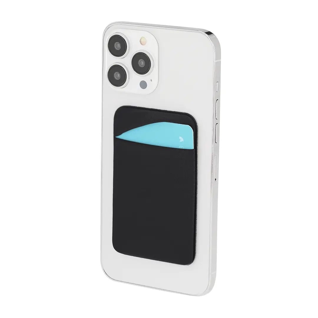 Funda multiusos fabricada en material elástico, diseñada para adaptarse cómodamente a diversos objetos personales como tarjetas, dinero, auriculares, llaves y más. Con sistema de fijación adhesiva.