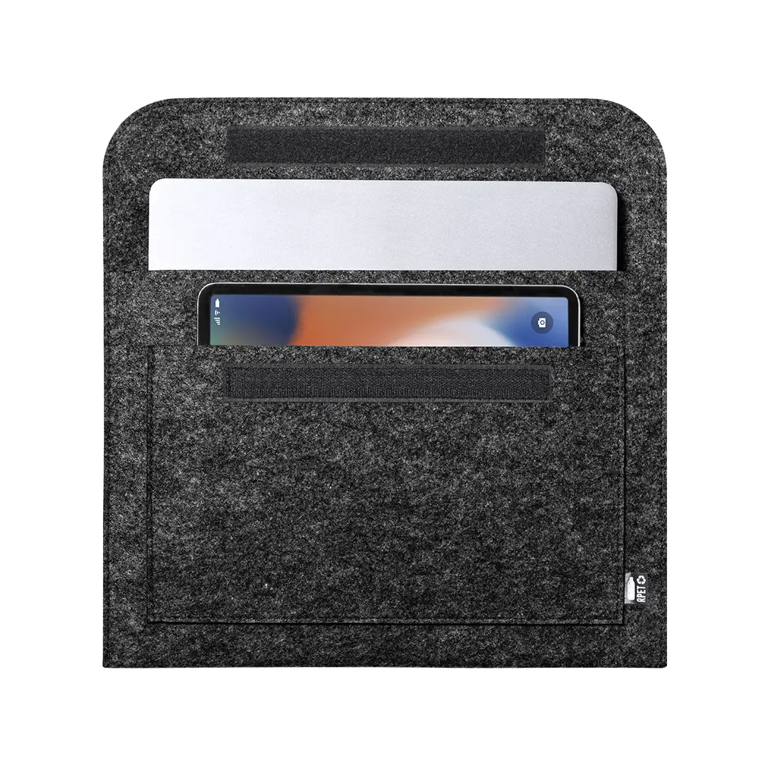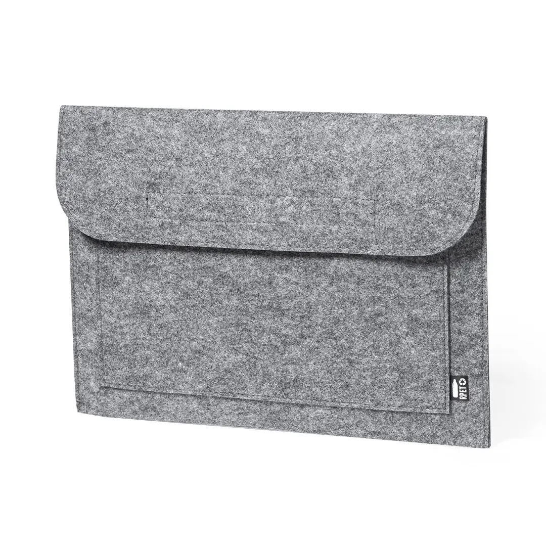 Funda para ordenador portátil de línea nature y en resistente fieltro RPET reciclado, fruto de la combinación del proceso de reciclaje de materiales plásticos junto con la técnica milenaria de fabricación del fieltro, dando como resultado un material de eco-tendencia que, además de ser de origen reciclado, también se convierte en reciclable. Solapa con cierres de velcro y bolsillo frontal, con distintivo RPET en etiqueta exterior.