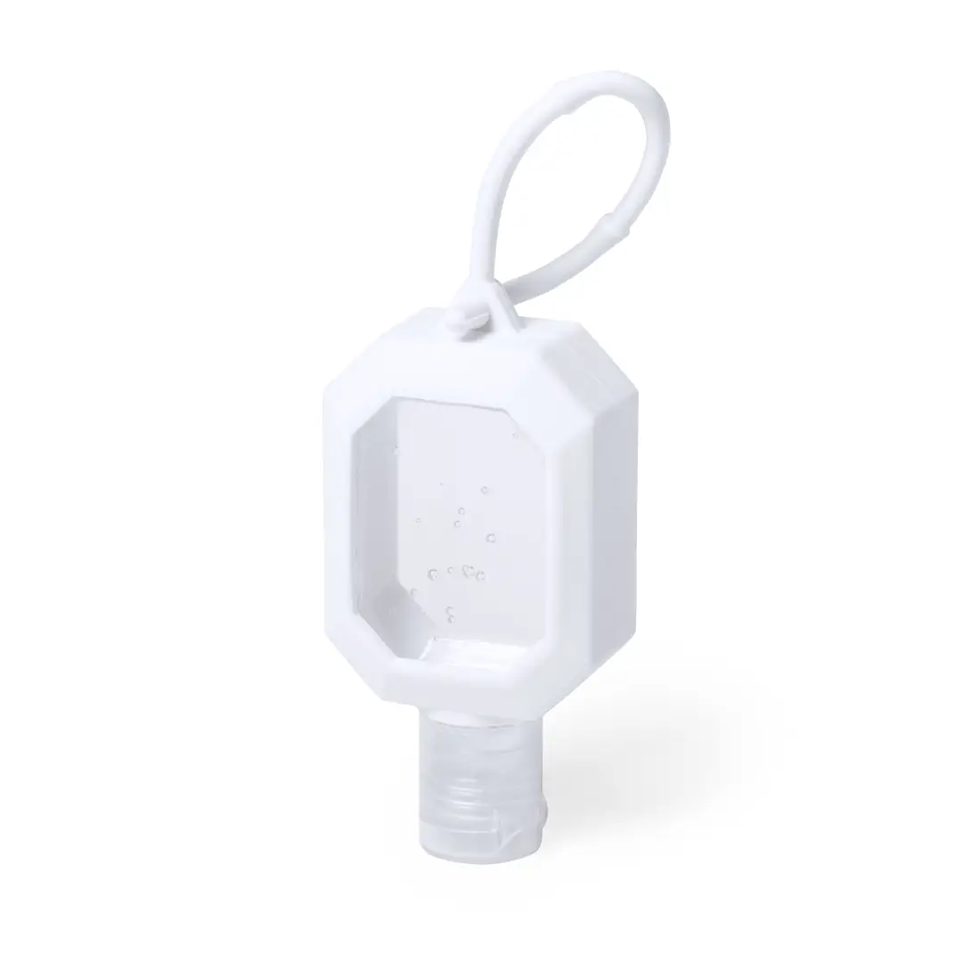 Gel hidroalcohólico para higiene y limpieza de la piel en bote rellenable de 30 ml, con extracto balsámico de Aloe Vera. Cuerpo en suave silicona de color blanco, con dosificador, tapón de seguridad y cordón en mismo material para transporte / fijación. Solución con 65% de contenido de alcohol. Disponible certificación 94/62/EC. Artículo con certificación GMP (Good Manufaturing Practices / Normas de Correcta Fabricación) que garantiza el cumplimiento de rigurosas medidas de control para la obtención de un producto seguro y de calidad.