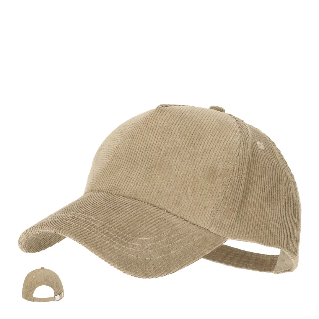 Gorra de 5 paneles fabricada en resistente poliéster efecto pana. Con orificios de ventilación bordados y cierre trasero ajustable de hebilla metálica. Disponible en variada gama de colores.