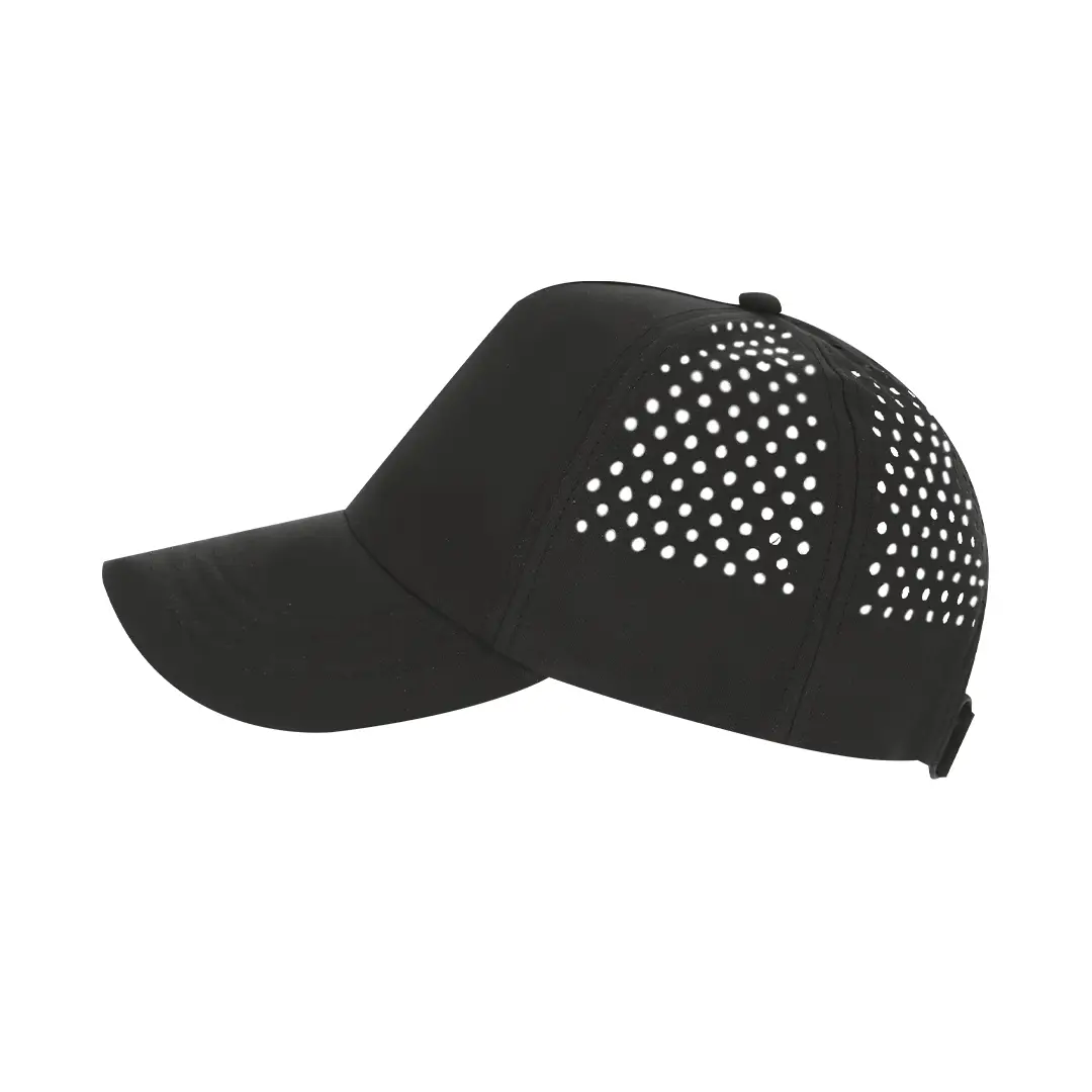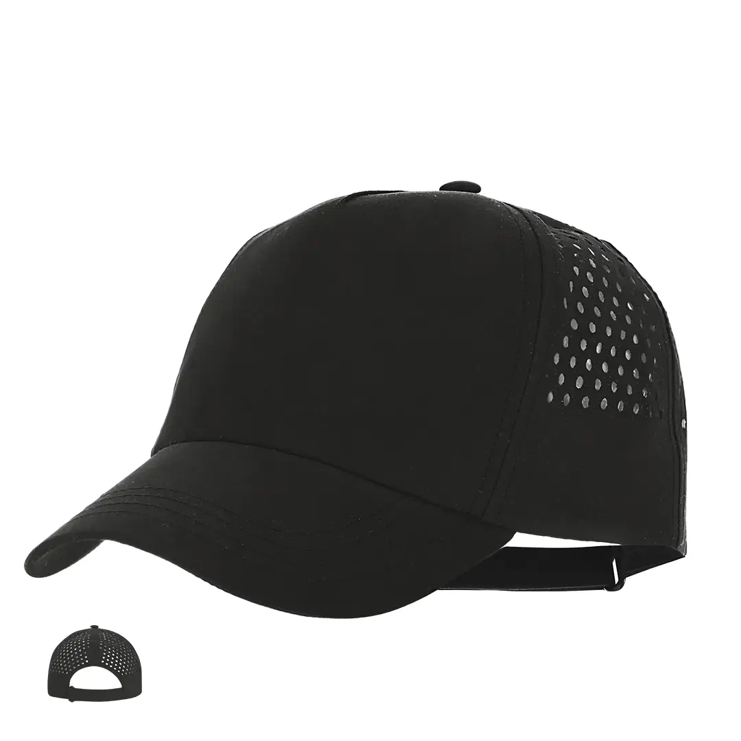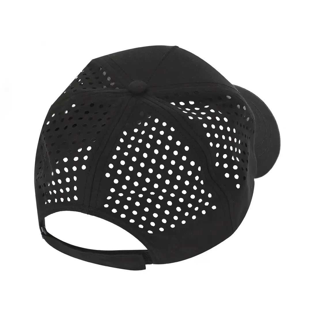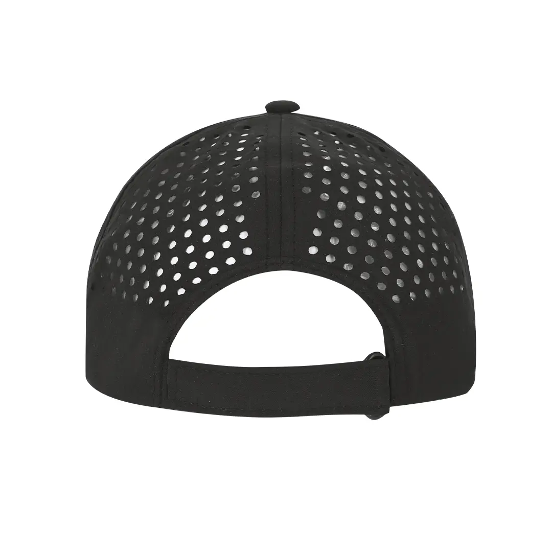 Gorra de 5 paneles en microfibra, parte trasera con diseño perforado, para óptima transpirabilidad y cierre ajustable de velcro.