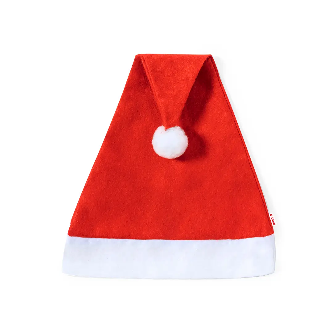 Divertido gorro de Papá Noel fabricado en RPET con suave banda y pom pom de color blanco.El material RPET se elabora a partir de plástico reciclado, para así fomentar la reutilización de residuos plásticos y ayudar a la sostenibilidad del planeta.