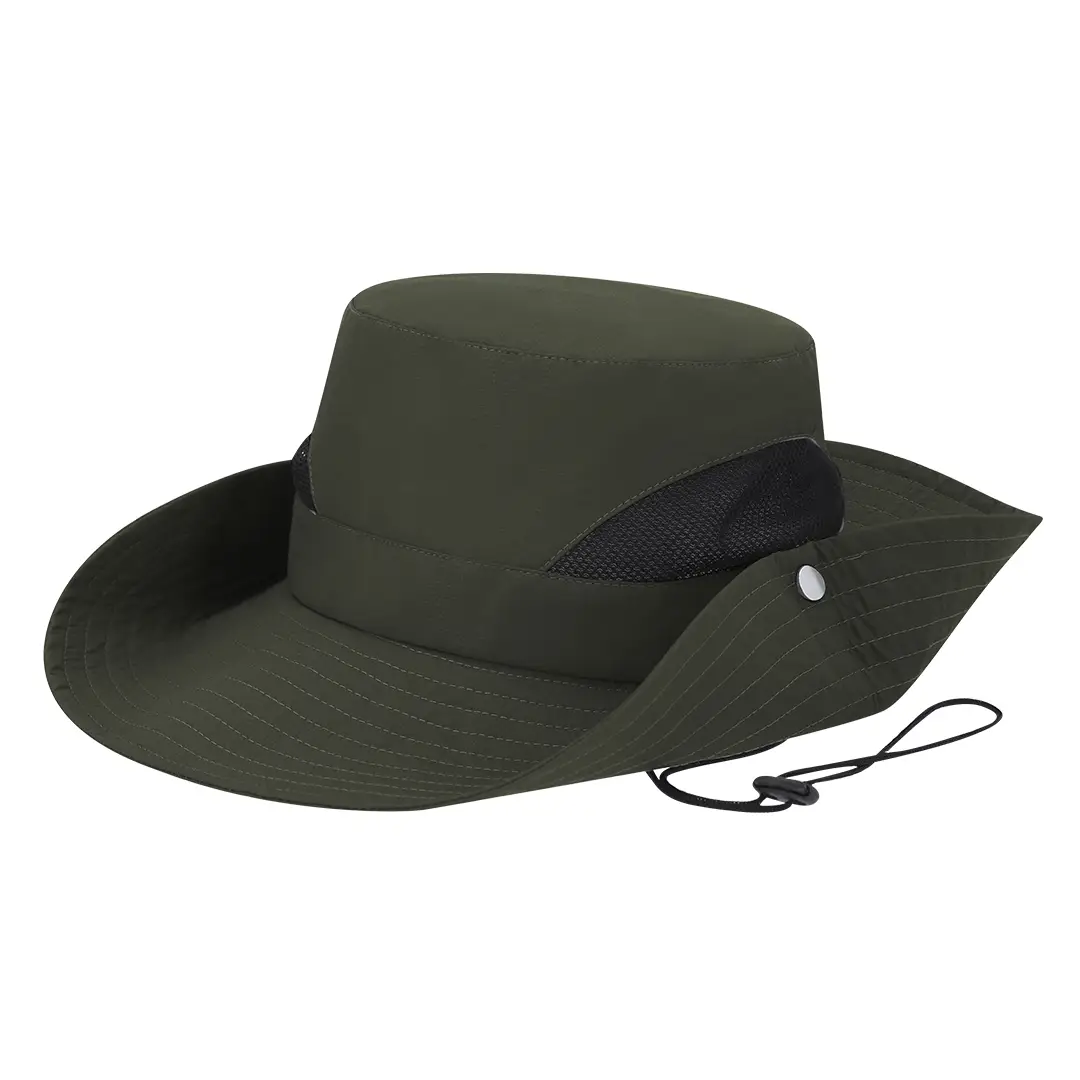 Gorro tipo safari en resistente material poliéster. De confortable interior, con refrescantes rejillas de ventilación laterales fabricadas con tela transpirable. Alas ajustables con cierres de botón metálicos y cordón de transporte ajustable.