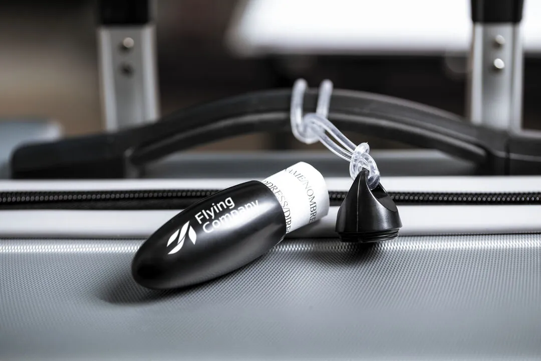 Original identificador de maletas con capucha en resistente material de extensa gama de vivos colores. Con resistente cinta de acople y tarjeta de identificación enrollada en castellano e inglés.