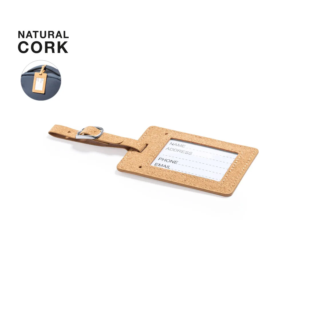Identificador para maletas de línea nature fabricado en corcho natural. Cinta de acople con cierre de hebilla metálica y tarjeta de identificación en inglés.
