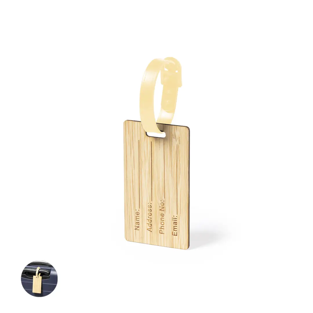 Identificador para maletas de línea nature fabricado en bambú. Cinta de acople con cierre de hebilla y datos de identificación en inglés, con cara opuesta lisa para marcaje.