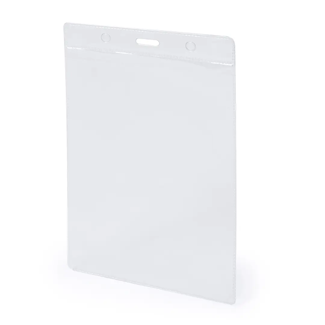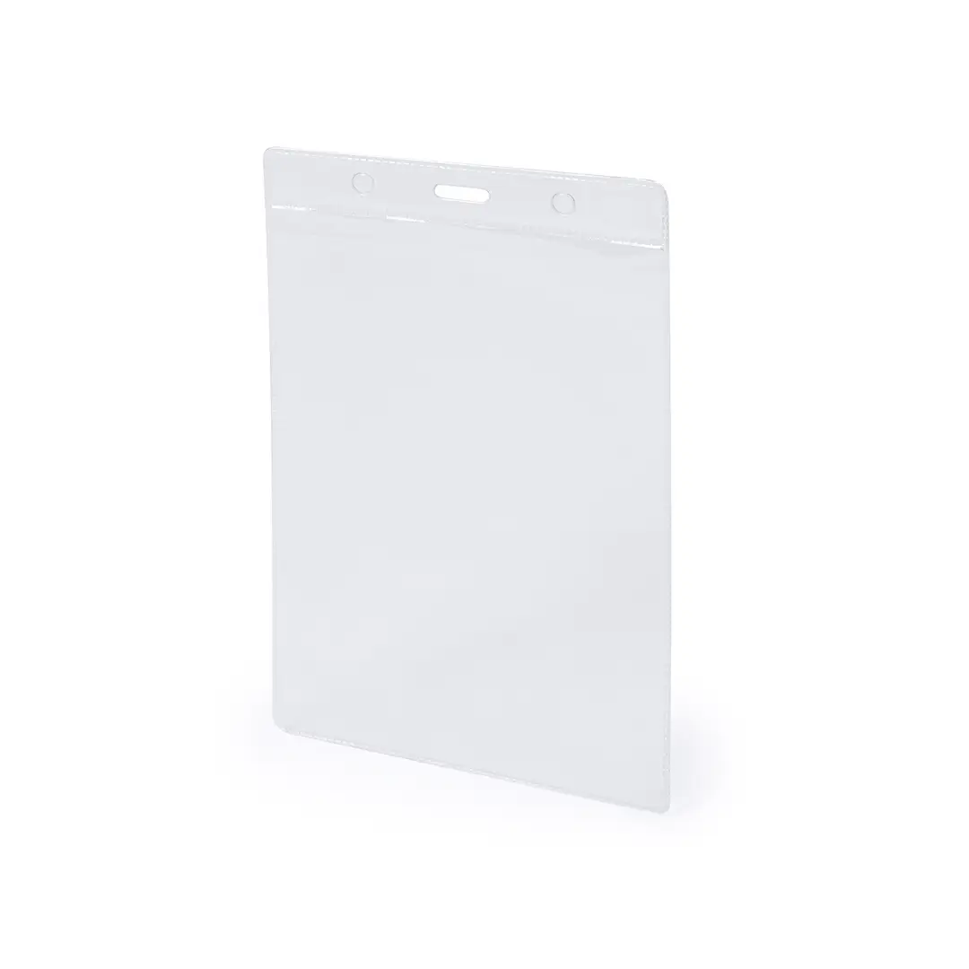 Identificador vertical de PVC. Práctico porta acreditaciones con parte superior reforzada y perforaciones tanto para la sujeción central como en los laterales.