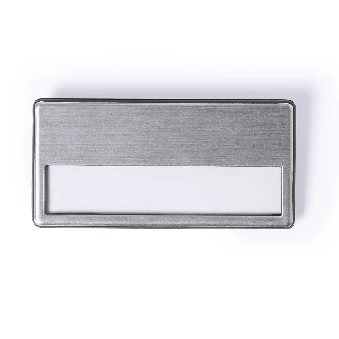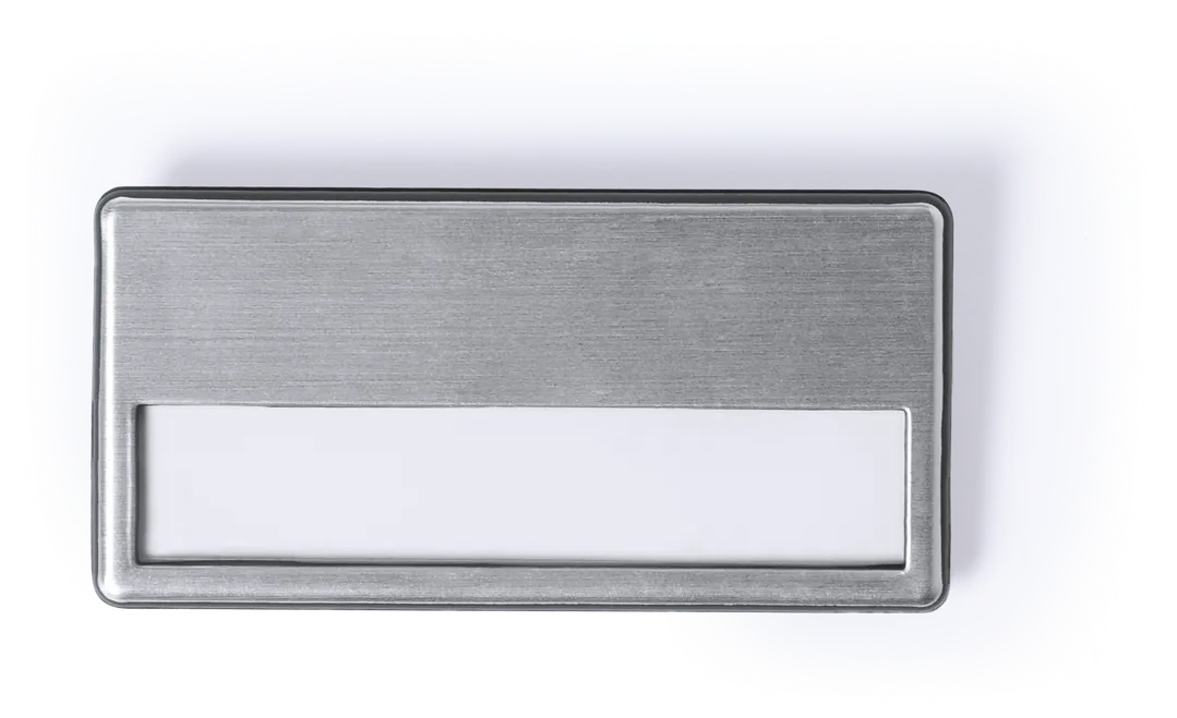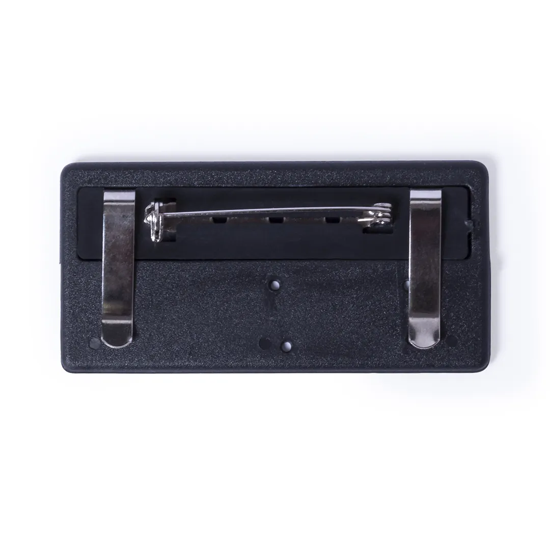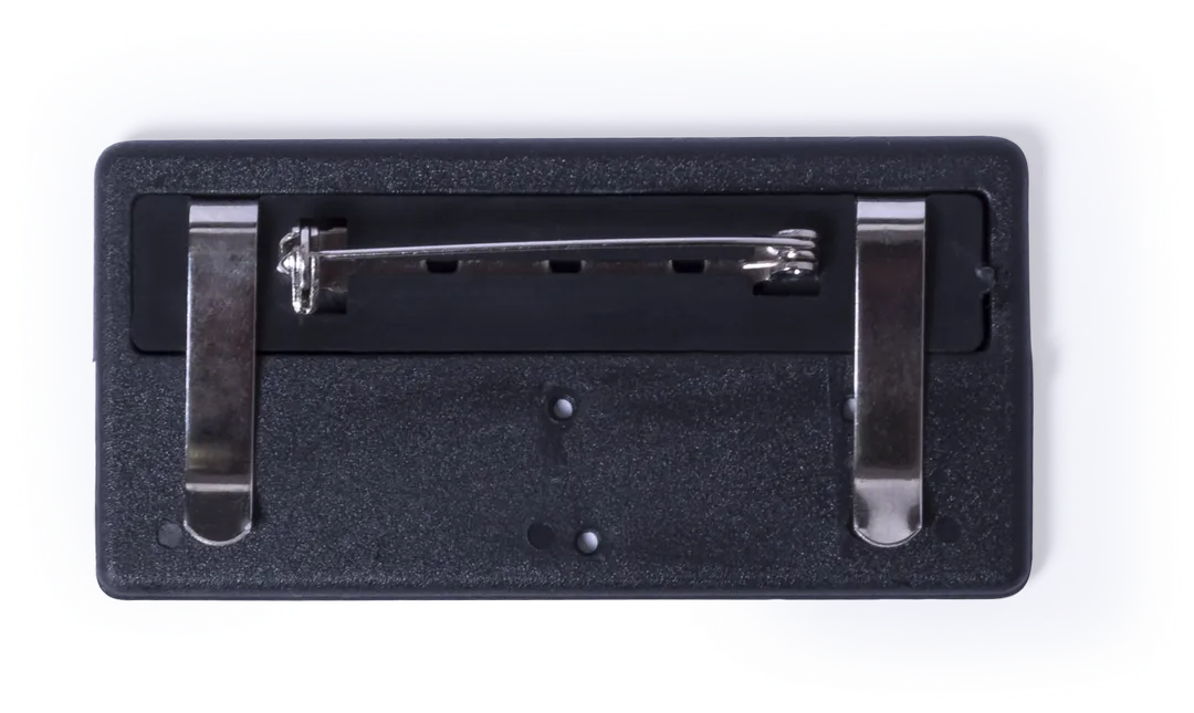 Identificador en acabado brillante. Parte trasera con doble sistema de fijación -pinzas de enganche metálicas e imperdible- para un ajuste seguro.