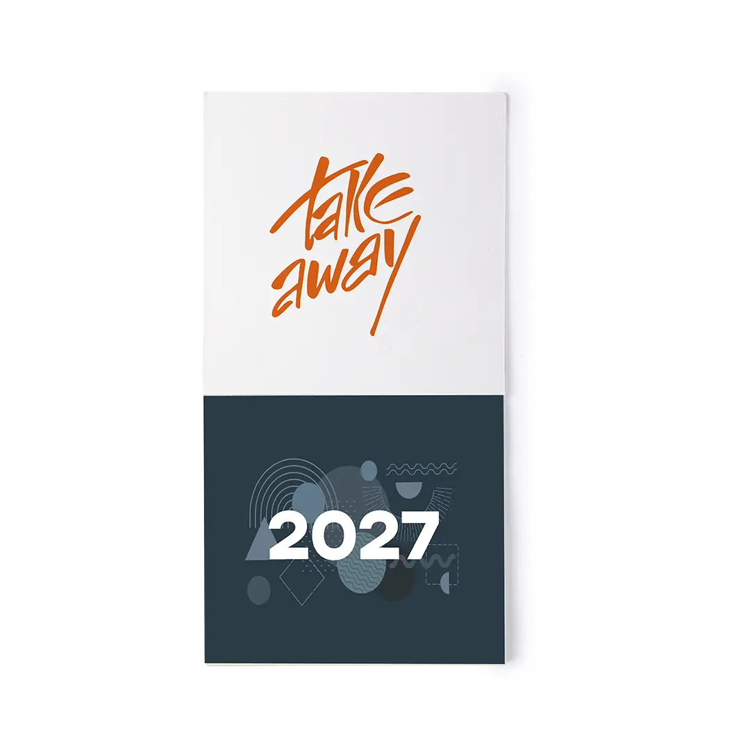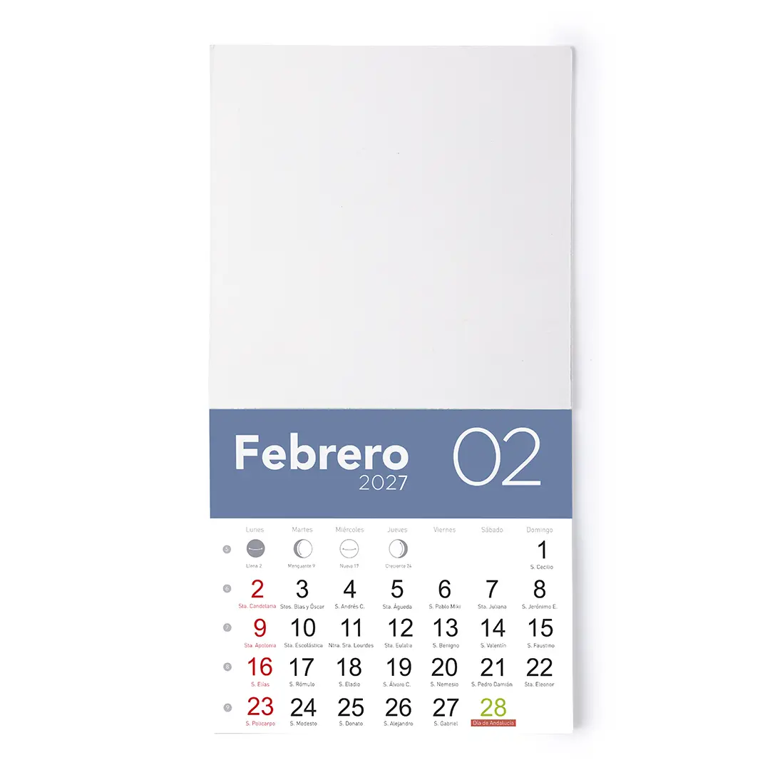 Práctico imán calendario en cartón. Diseño mes en curso y santoral. Con amplia superficie de marcaje.