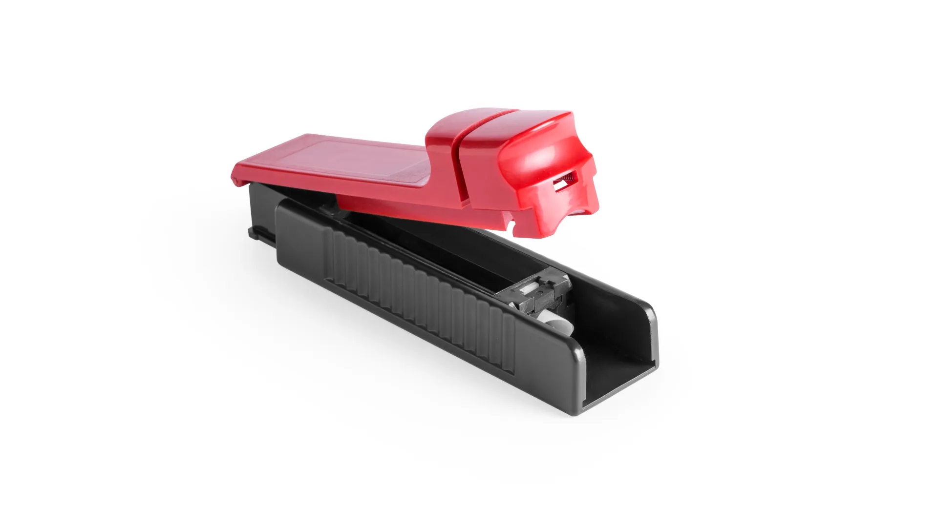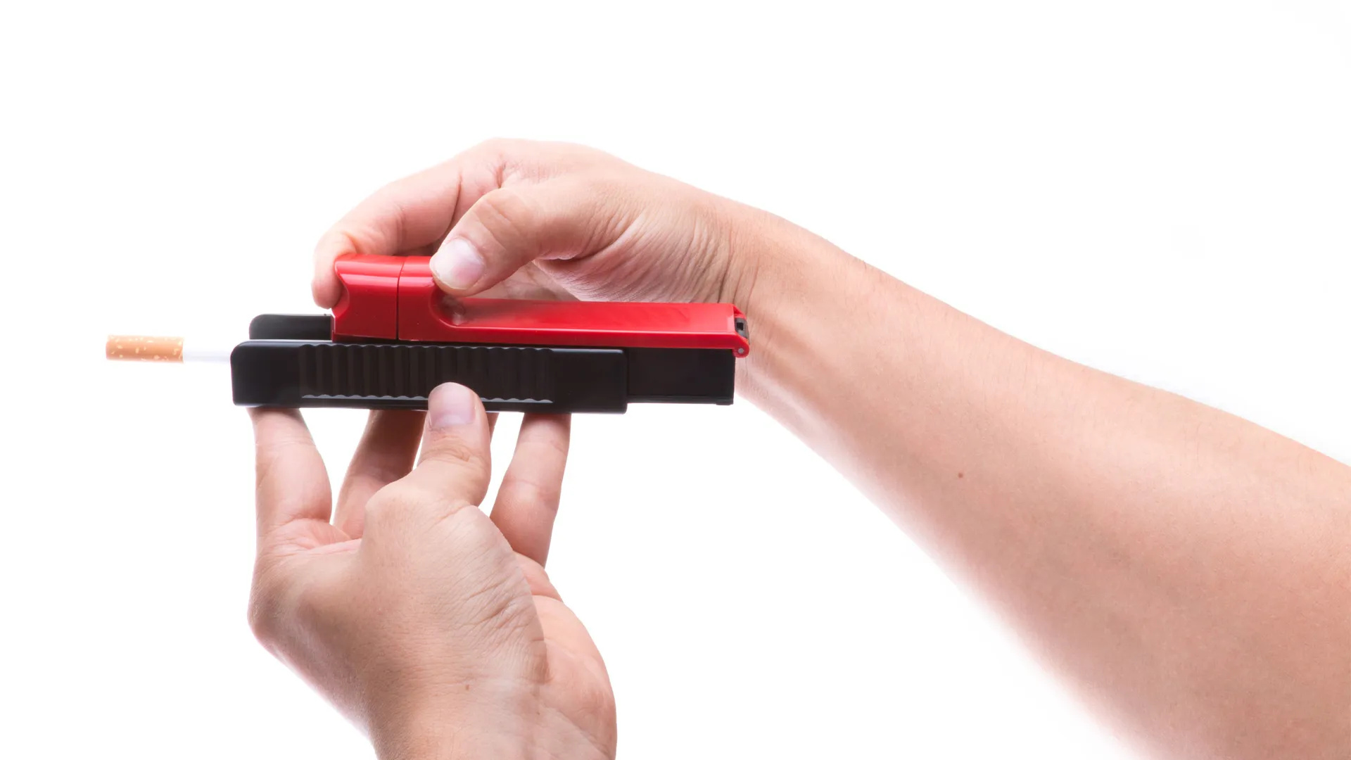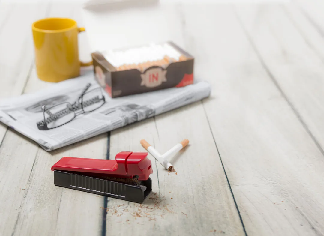 Inyectora para tabaco en diseño bicolor y variada gama de colores. Con pulsador de entubado y presentada en caja individual de diseño.