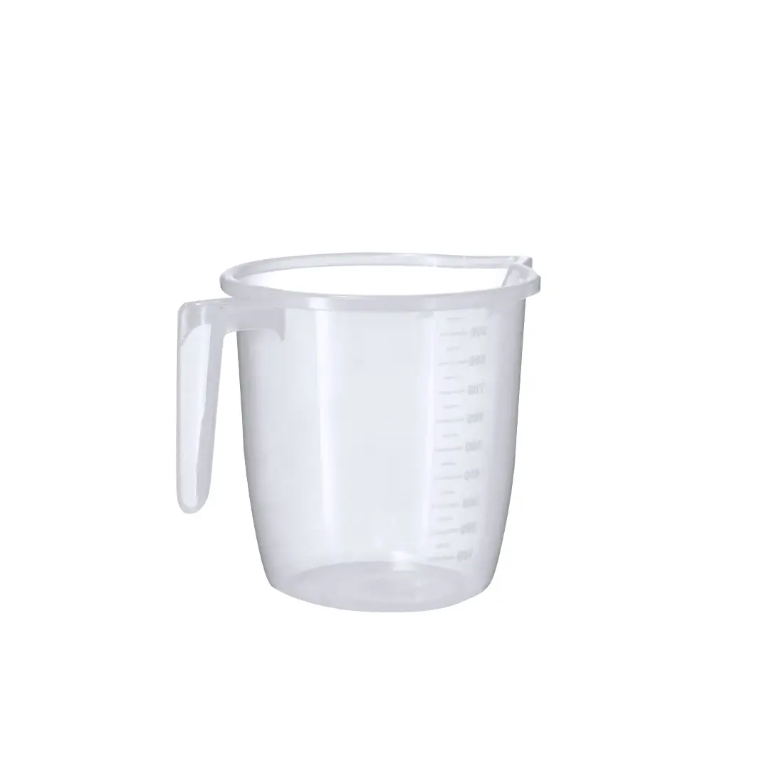 Jarra medidora de 1L confeccionado principalmente en resistente PP transparente con asa. Con medidor lateral en tramos de 100 ml y 50 ml. Incluye vertedor en el borde para evitar derrames.