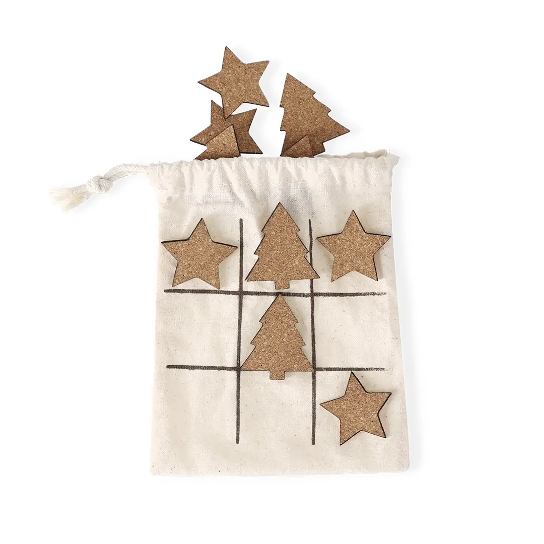 Juego de tres en raya fabricado en corcho natural. Incluye 5 fichas con forma de árbol y 5 fichas con forma de estrella. Presentado en bolsa de algodón con cierre de cordón, facilitando su almacenamiento y convirtiéndose en tablero de juego.Elaborado con elementos vegetales para así fomentar la utilización de materias primas naturales y reducir las emisiones contaminantes.
