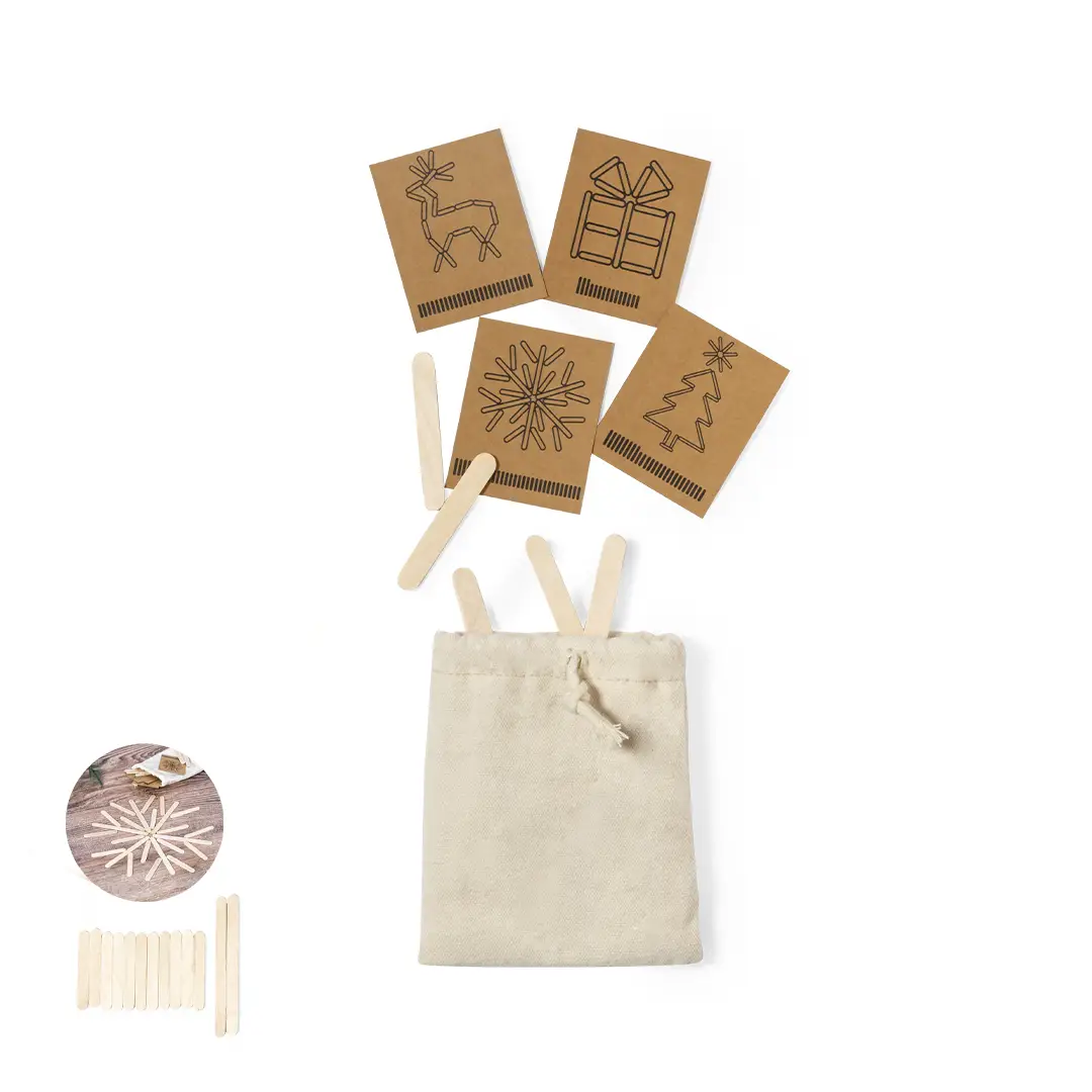 Original juego de habilidad que consiste en construir correctamente las figuras presentadas en las tarjetas visuales con las diferentes piezas del juego. Un divertido juego con el que fomentar la agilidad mental. Incluye 36 piezas de madera natural en diferentes tamaños para construir las figuras(8 largas y 28 cortas) y 4 divertidos diseños de estrellas con tarjetas visuales en cartón reciclado. Presentado en bolsa 100% algodón.Elaborado con elementos vegetales para así fomentar la utilización de materias primas naturales y reducir las emisiones contaminantes.
