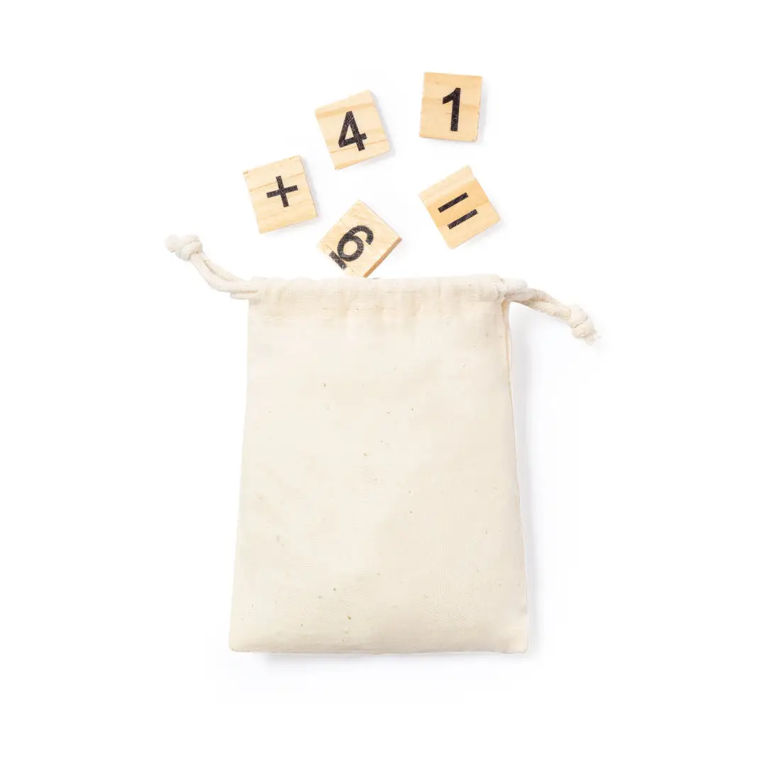 Juego de calculo fabricado en resistente madera natural de pino. Set de 32 piezas en bolsa de transporte 100% algodón con cordones de cierre a juego.