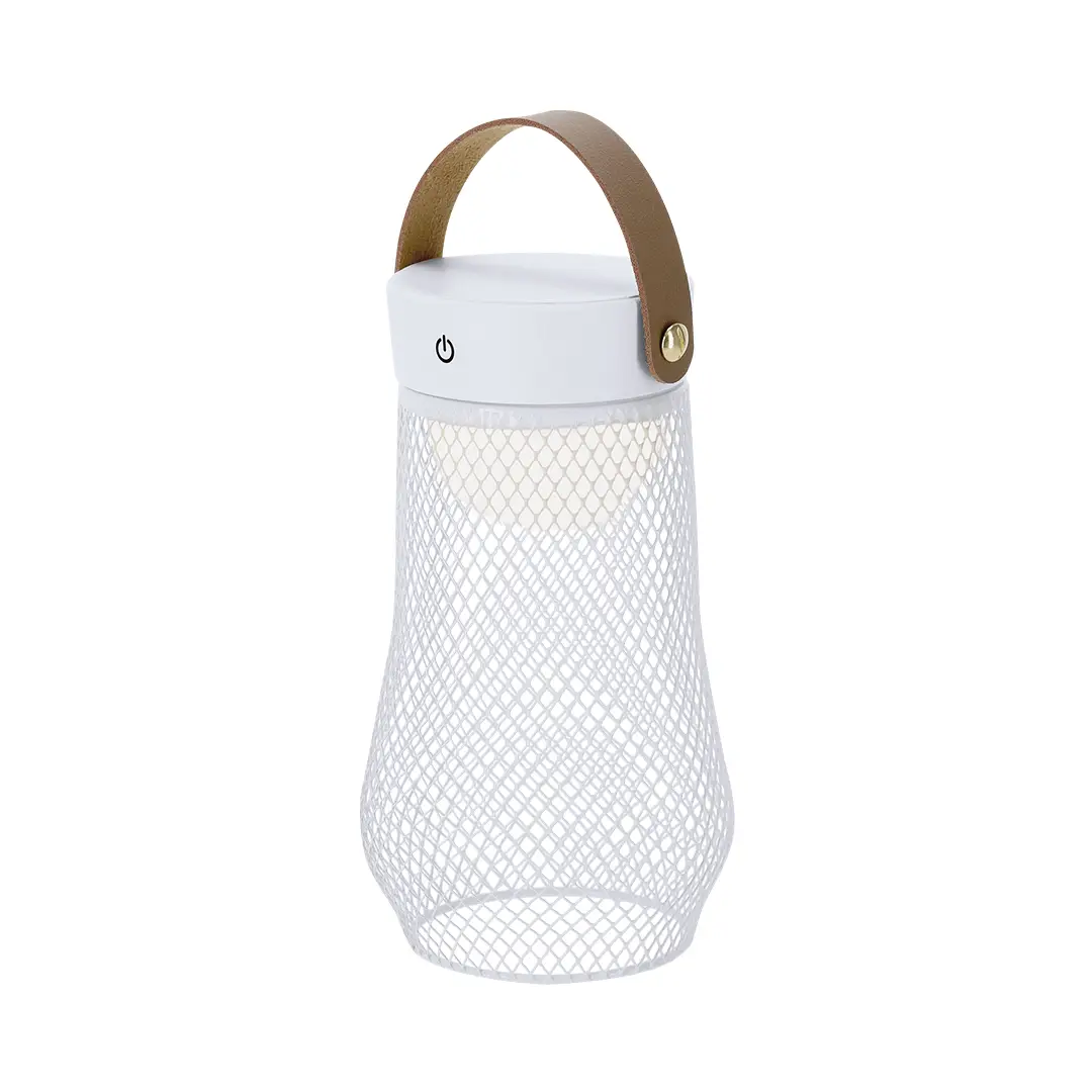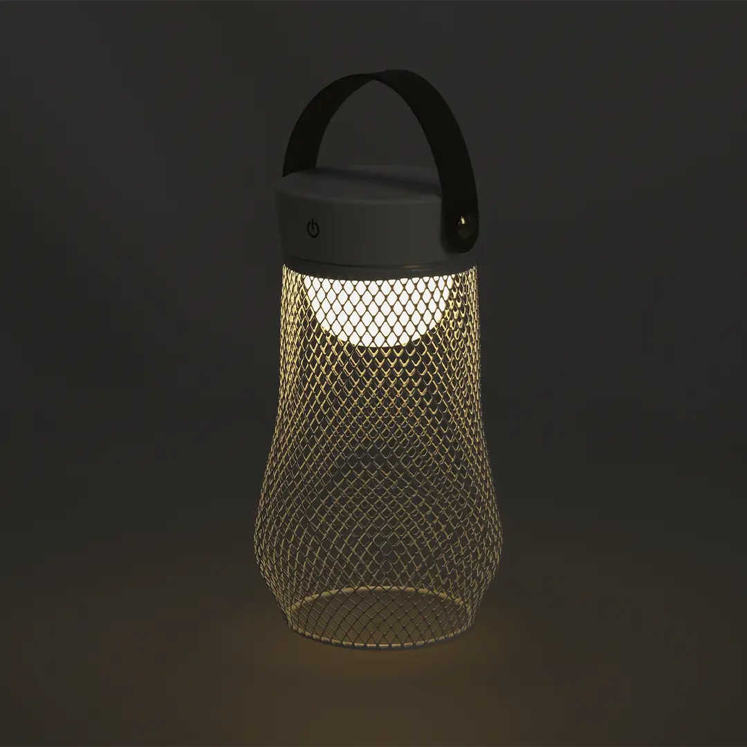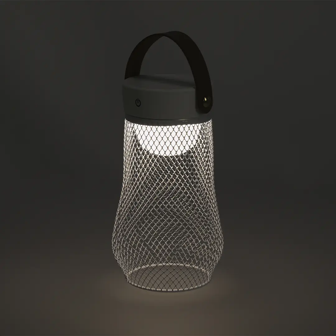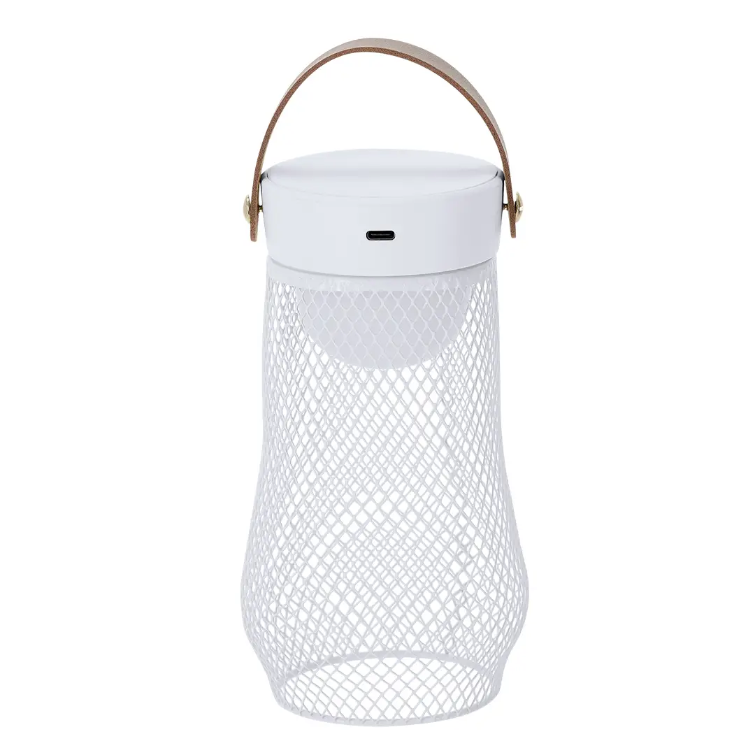 Lámpara de diseño en metal. Incluye asa superior en suave PU. Dispone de 3 modos de luz (blanca, neutra y cálida). Equipada con 24 LEDs. Ideal tanto para espacios interiores como exteriores. Botón táctil integrado para encendido, apagado y la selección del modo de luz. Equipada con batería recargable de 1.200 mAh y entrada Tipo C.