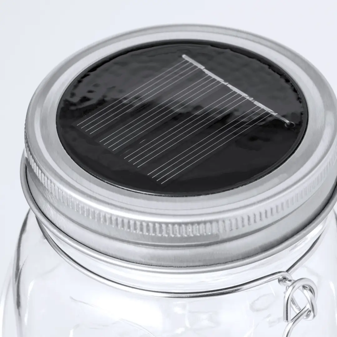 Original lámpara tarro solar, fabricada en resistente material cristal y con una tira interior decorativa de 20 LEDs. Incluye tapadera a rosca metálica con minipanel solar de recarga integrado y una batería recargable de 300 mAh. Con práctica asa para transportar o colgar, y presentada en caja individual de diseño kraft.