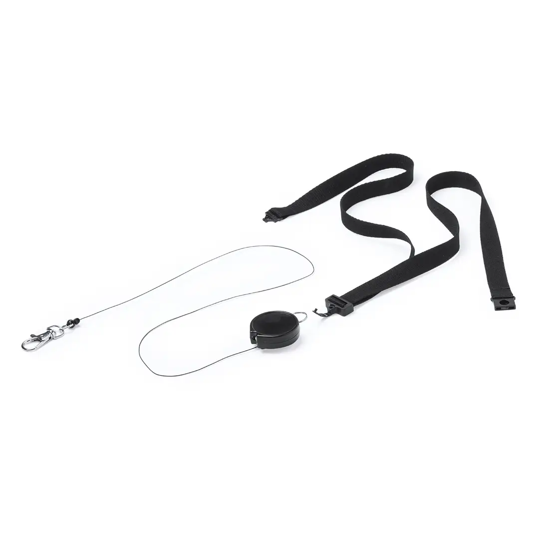 Práctico lanyard en poliéster con accesorio extensible. Accesorio de seguridad en el cuello y accesorio retráctil extensible con clip de ajuste en un lado, dejando el otro lado libre para el logotipado. Mosquetón metálico. Conjunto disponible en colores blanco y negro.