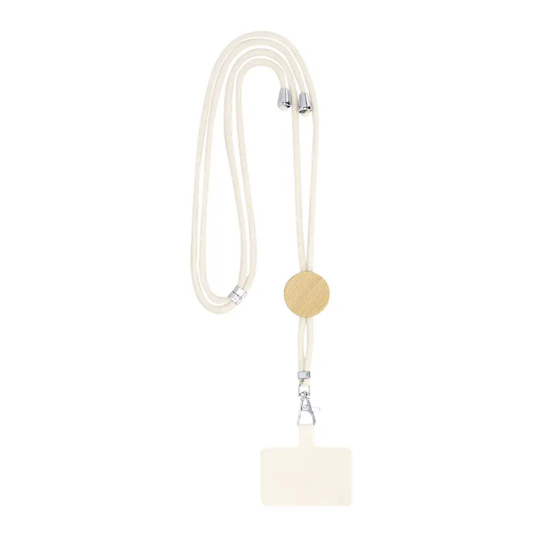 Original lanyard con accesorio para smartphone. Fabricado en resistente algodón, con accesorio de bambú para marcaje. Accesorio de transporte para situar entre la funda y el smartphone y mosquetón giratorio metálico. Ajustadores en cuello, con accesorios cromados en los extremos de los cordones de ajuste.Materiales como el bambú fomentan la utilización de materias primas naturales, reduciendo las emisiones contaminantes. Proviene de una planta de gran resistencia y versatilidad, con crecimiento y regeneración rápidos, siendo una excelente alternativa al uso de madera tradicional.