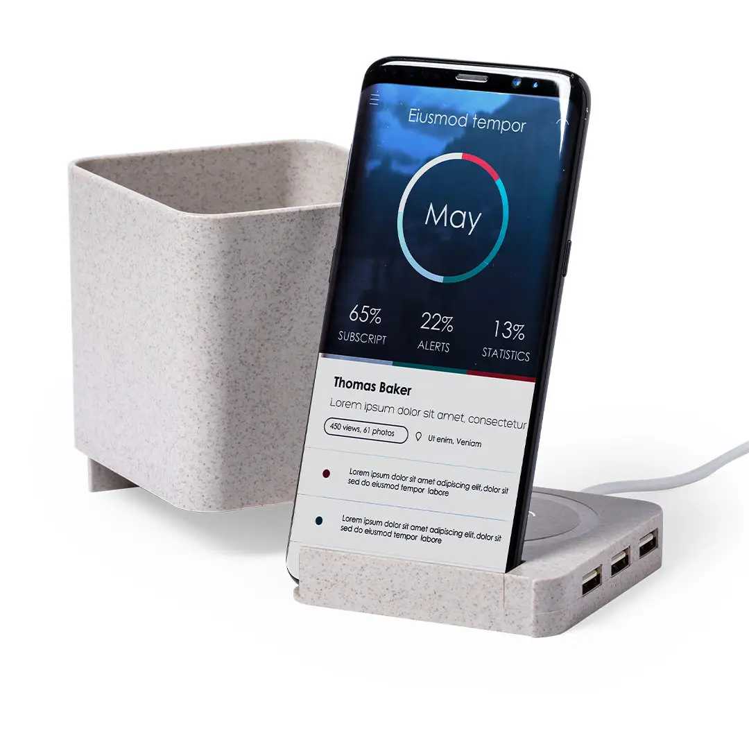 Lapicero multifunción 4 en 1 de línea nature. Carcasa en caña de trigo, para así fomentar la utilización de materias primas naturales y reducir las emisiones contaminantes. Con funciones lapicero, soporte para smartphone, cargador inalámbrico y puerto USB (3xUSB 2.0). Compatible con smartphones con tecnología de carga inalámbrica, incluye cable micro USB en color blanco de 1 metro de largo. Presentado en atractiva caja de diseño eco. Disponible manual de instrucciones en español e inglés.