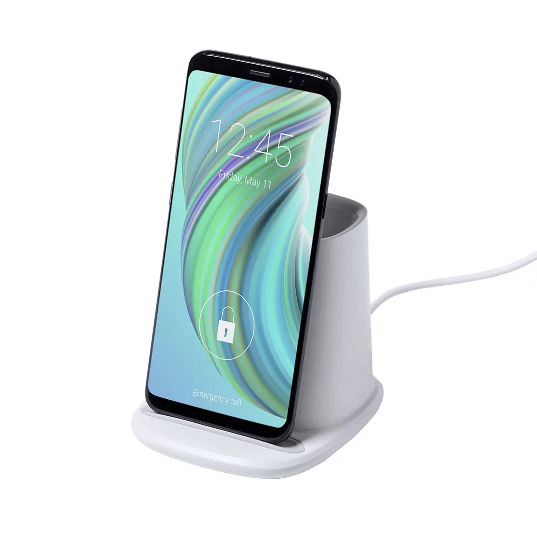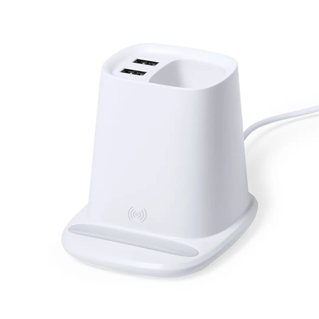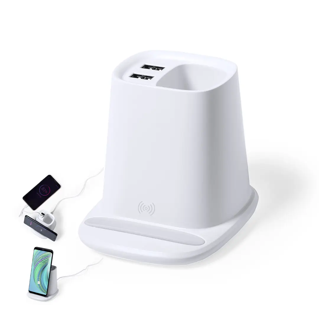 Lapicero multifunción 4 en 1, fabricado en resistente material ABS de color blanco. Con funciones lapicero, soporte para smartphone, cargador inalámbrico 5W y 2 salidas USB de 2.000 mA. Puerto USB inferior, apto para transferencia de datos. Compatible con smartphones con tecnología de carga inalámbrica. Incluye cable tipo C de 1 metro de largo y viene presentado en atractiva caja de diseño. Disponible manual de instrucciones en español e inglés.