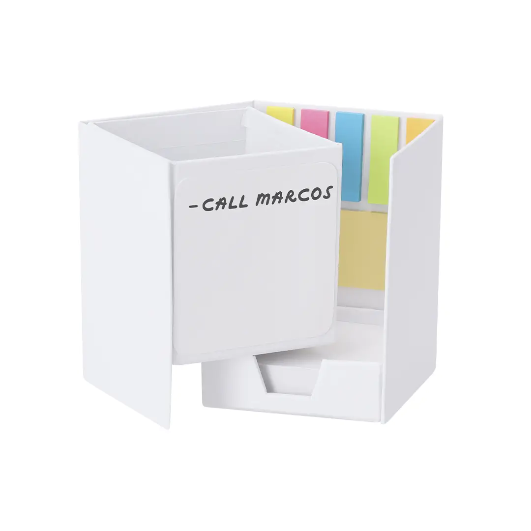 Lapicero Portanotas Pizarra en cartón reciclado. Práctico cubo desplegable con 170 hojas de 7×7 cm y 125 mininotas adhesivas de 3,8x 1,2cm en variados colores, 25 mininotas de 7,5 x 3,5 cm con práctico hueco para usar como lapicero. Lado frontal con función pizarra.