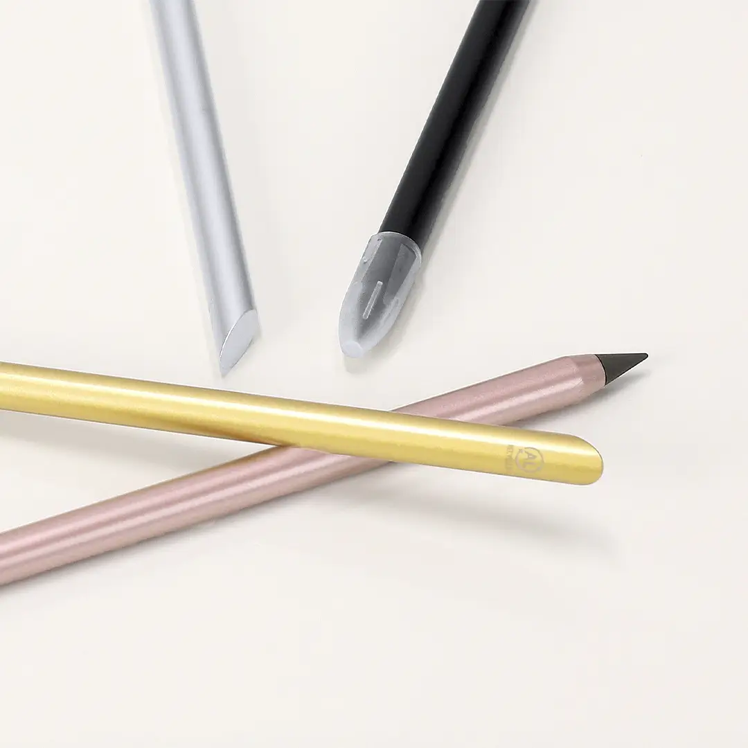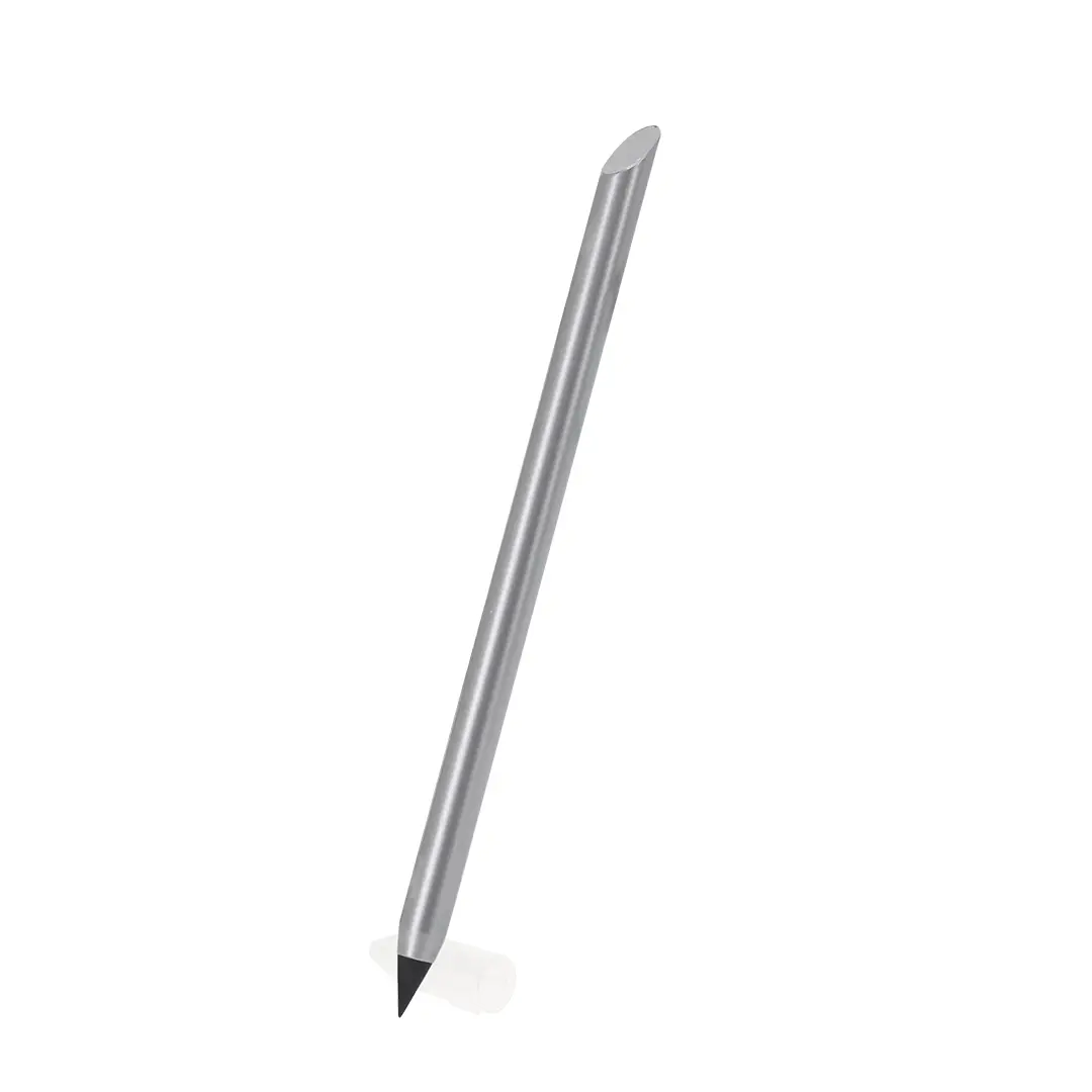 Lápiz eterno fabricado en aluminio reciclado. Reutilizable y con escritura infinita, para así usar siempre el mismo lápiz y no generar residuos. Incluye distintivo de aluminio reciclado en la parte superior y cubierta protectora para resguardar la punta de grafito.