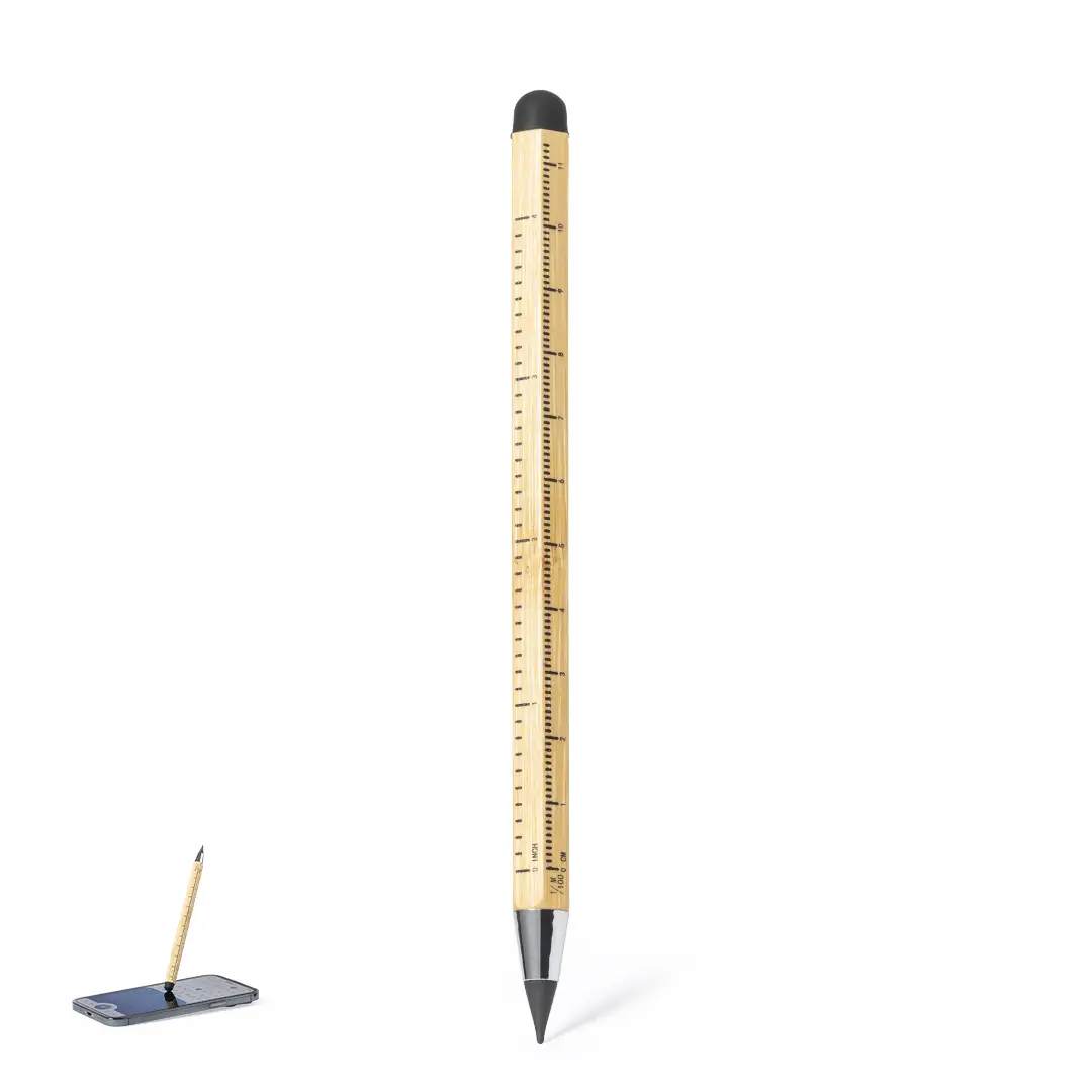 Lápiz eterno multifunción fabricado en bambú. Funciones lápiz, puntero táctil y regla, con medidas en centímetros (11) y pulgadas (4). Reutilizable y con escritura infinita, para así usar siempre el mismo lápiz y no generar residuos.