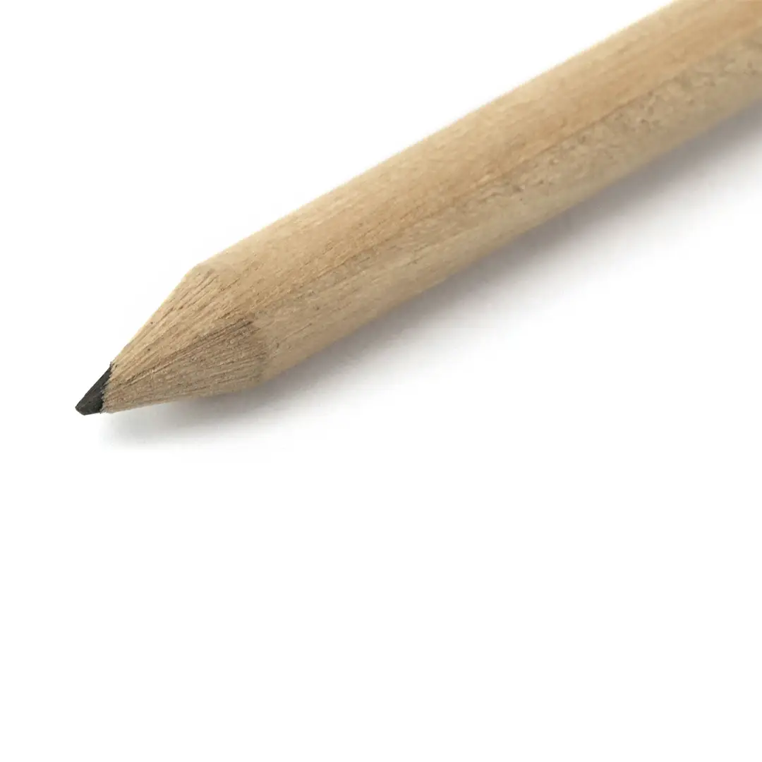 Minilápiz de madera de acabado natural. Con cuerpo redondo y goma de borrar en color blanco. Mina negra y punta afilada.