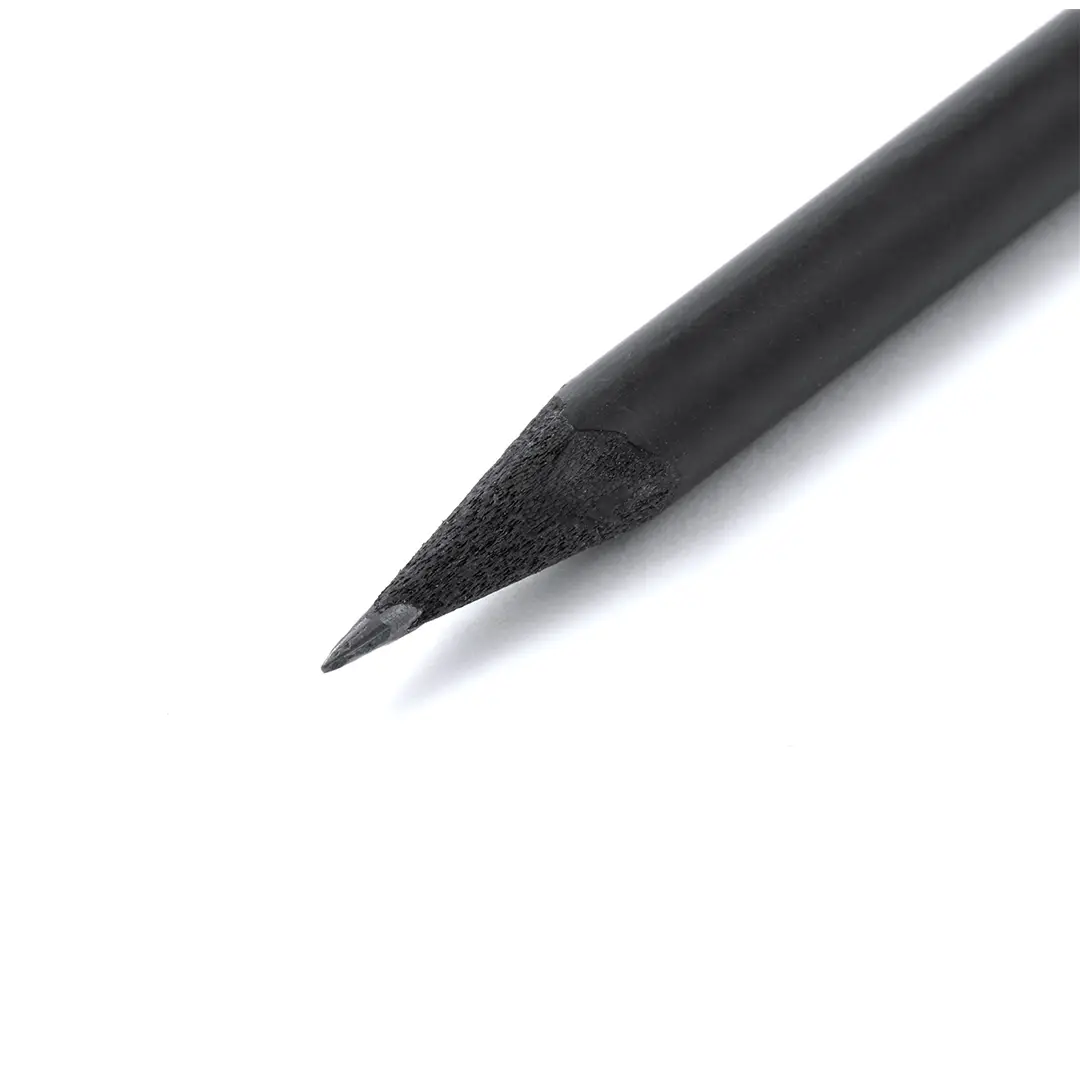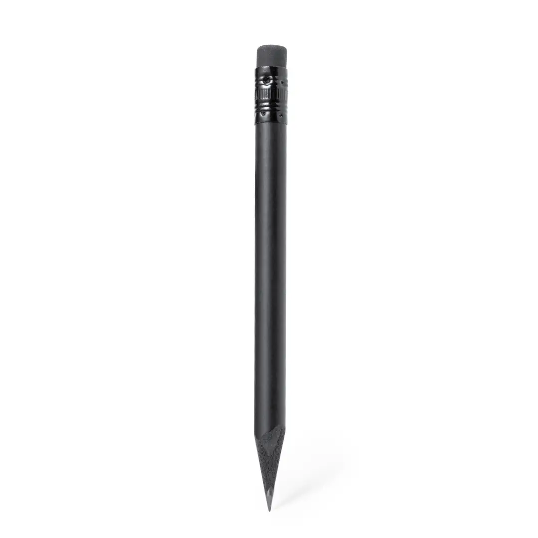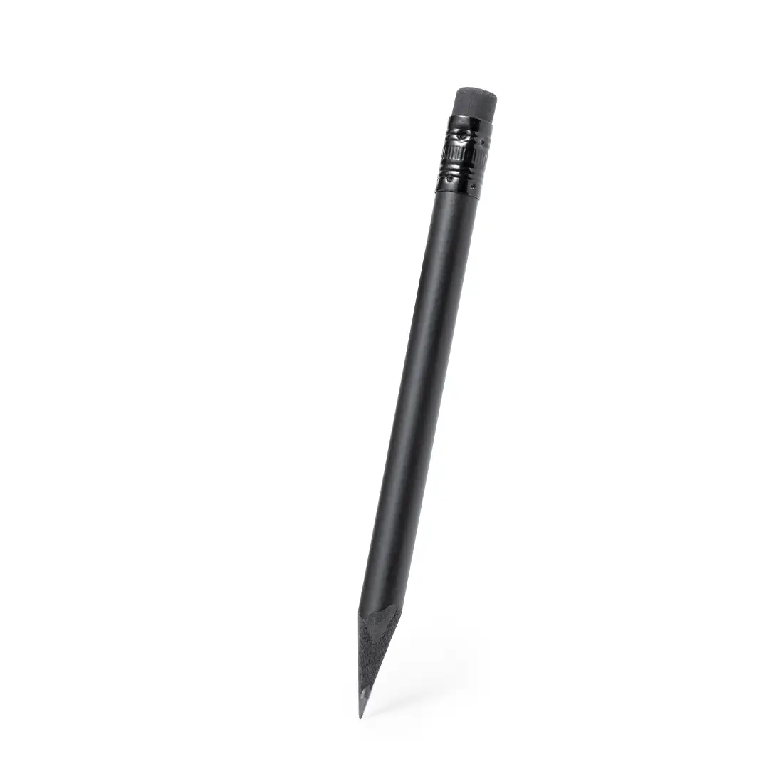 Lápiz de madera natural en acabado negro mate, con mina negra, punta afilada y goma en la parte superior a juego.