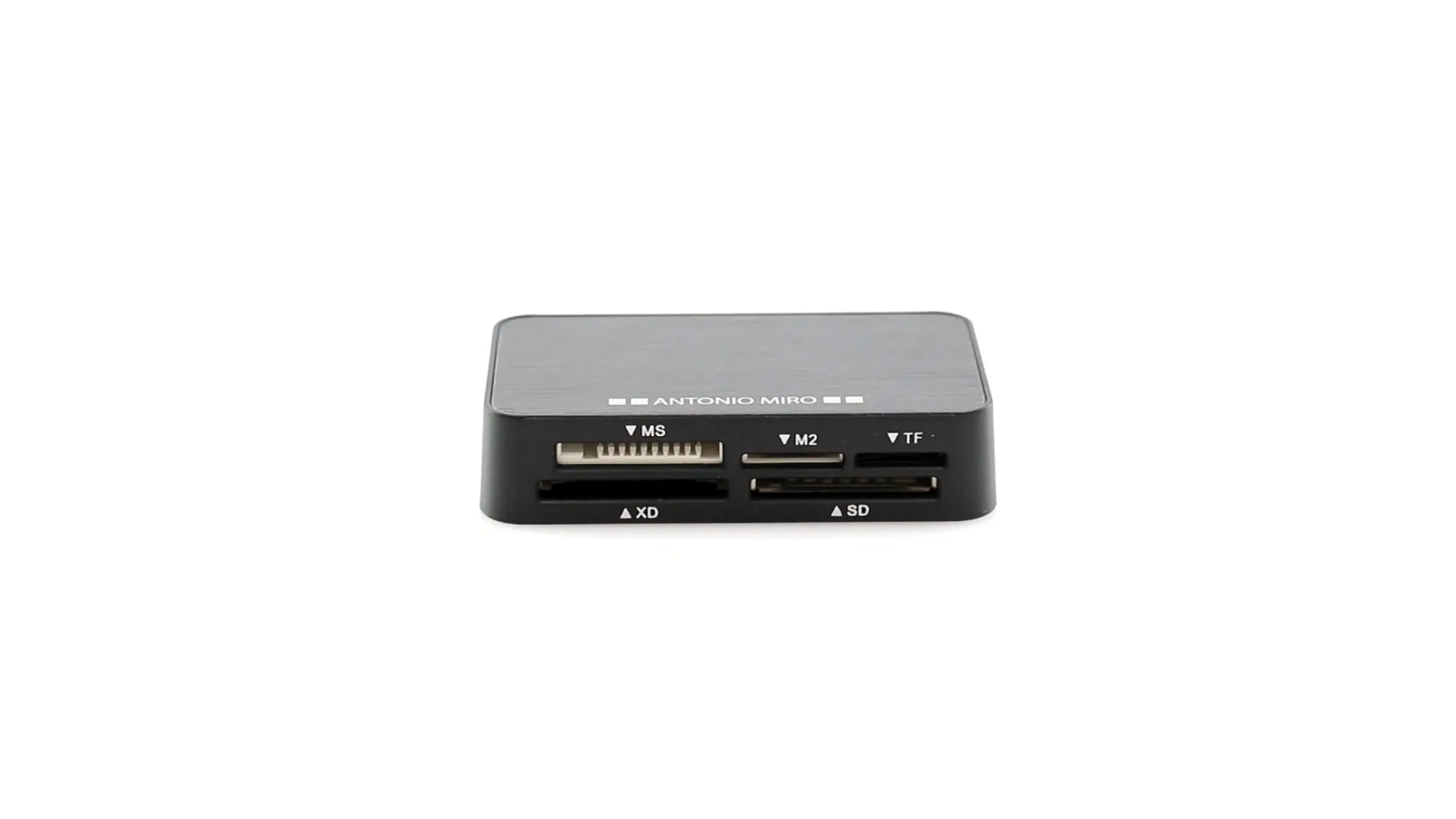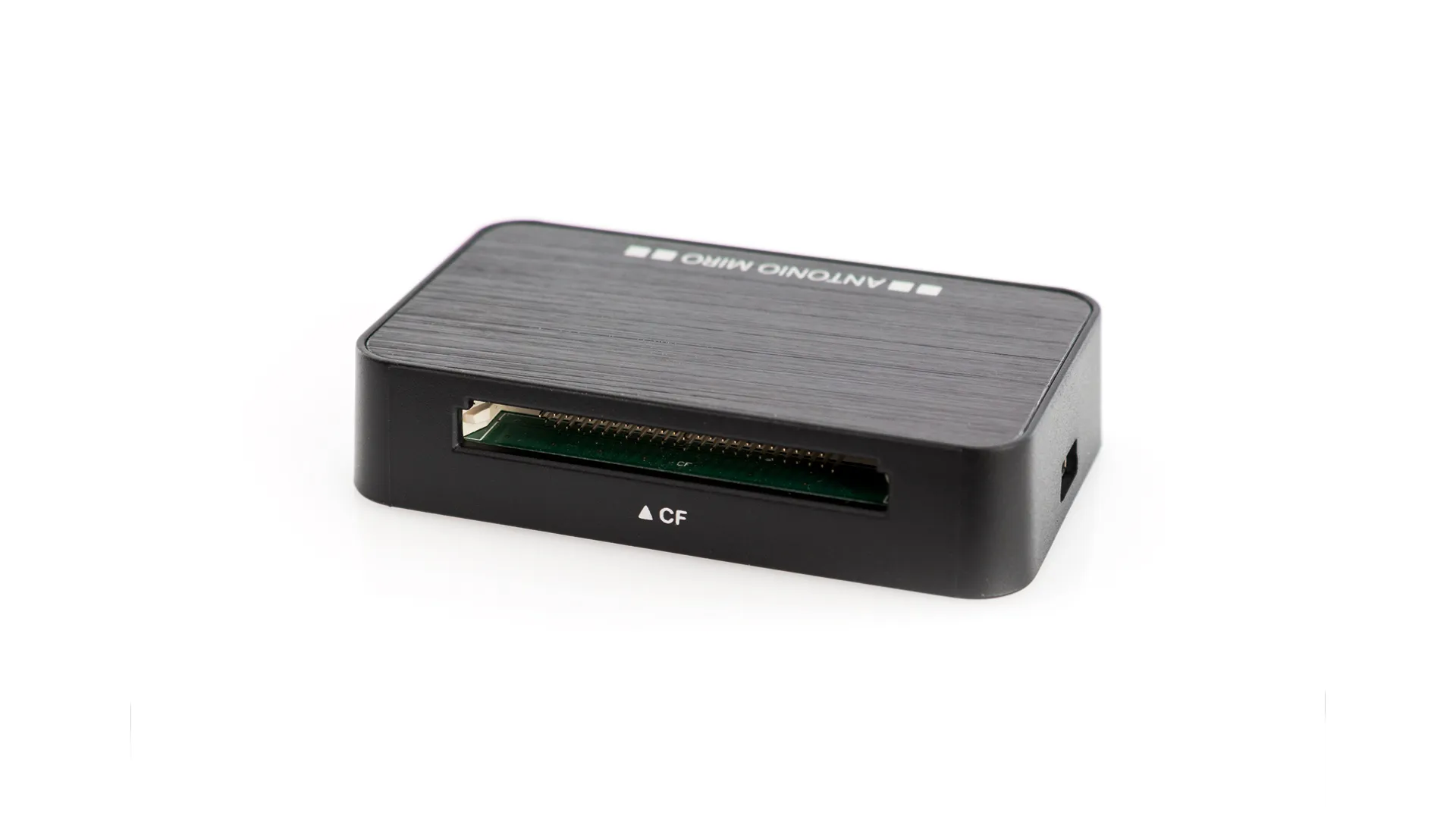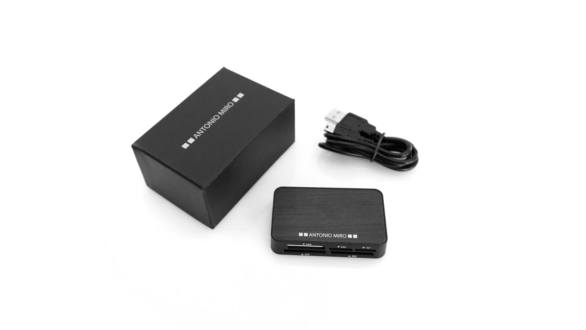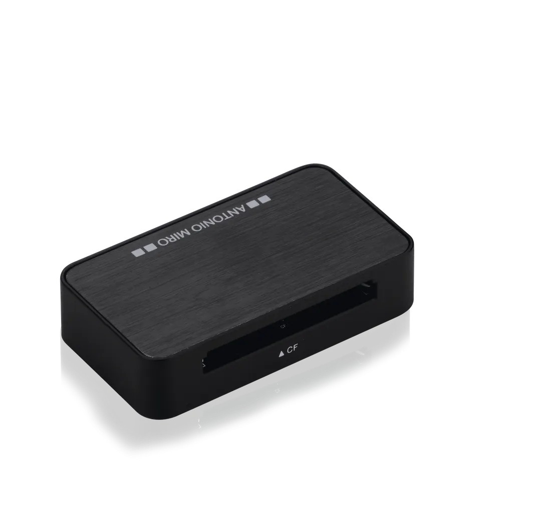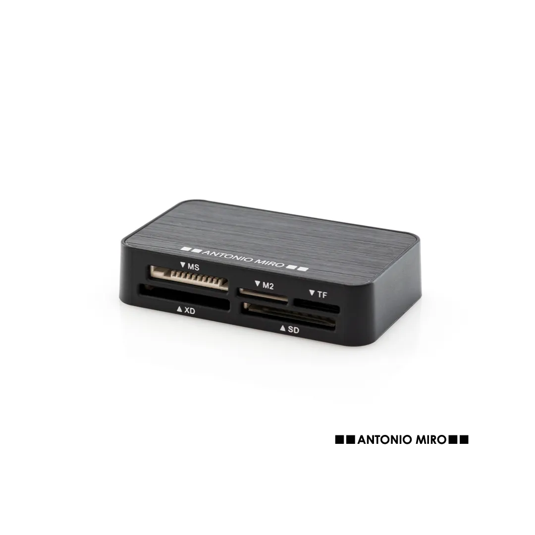 Lector de tarjetas de Antonio Miró con parte superior acabada en aluminio de elegante color negro. Compatible con tarjetas MS, M2, TF, XD, SD y CF. Presentado en caja individual con logotipo de la marca e interior troquelado en suave espuma.