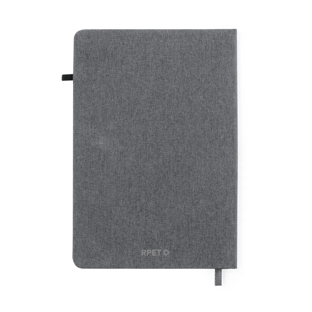 Libreta alfombrilla elaborada en RPET 300D con tapas rígidas. Destaca por su original soporte en la portada con forma ergonómica para la muñeca y así poder usarse como alfombrilla de ratón. Incluye marcapáginas y un soporte para bolígrafo a juego. Contiene 100 hojas interiores lisas y está disponible en un elegante color gris. Con logotipo RPET en contraportada y presentada en bolsa individual reciclada.El material RPET se elabora a partir de plástico reciclado, para así fomentar la reutilización de residuos plásticos y ayudar a la sostenibilidad del planeta.