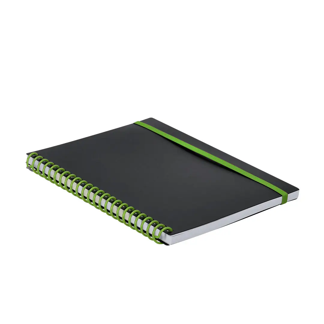Libreta de anillas con tapas flexibles fabricadas en PP. Interior con 80 hojas color blanco de disposición a una raya. Incluye goma elástica a juego con anillas.
