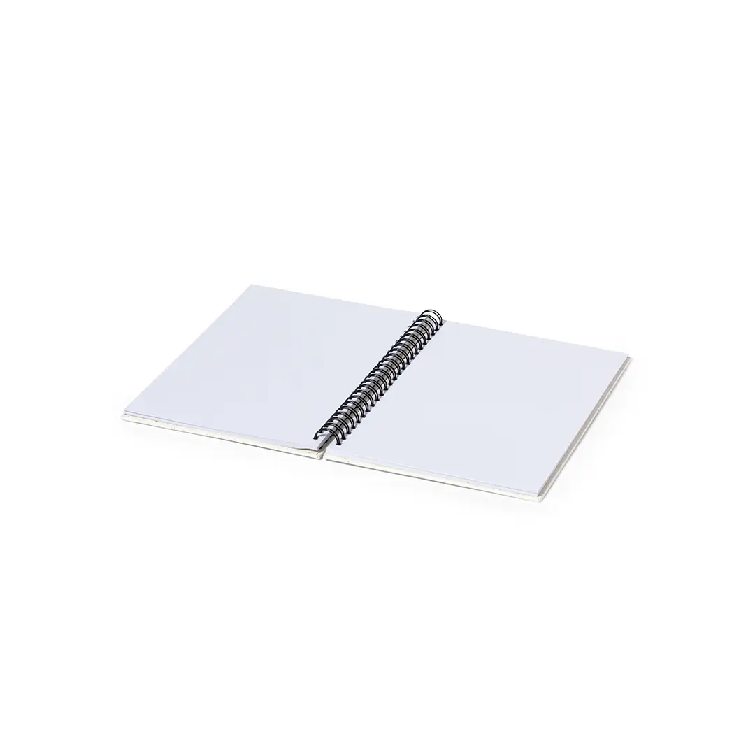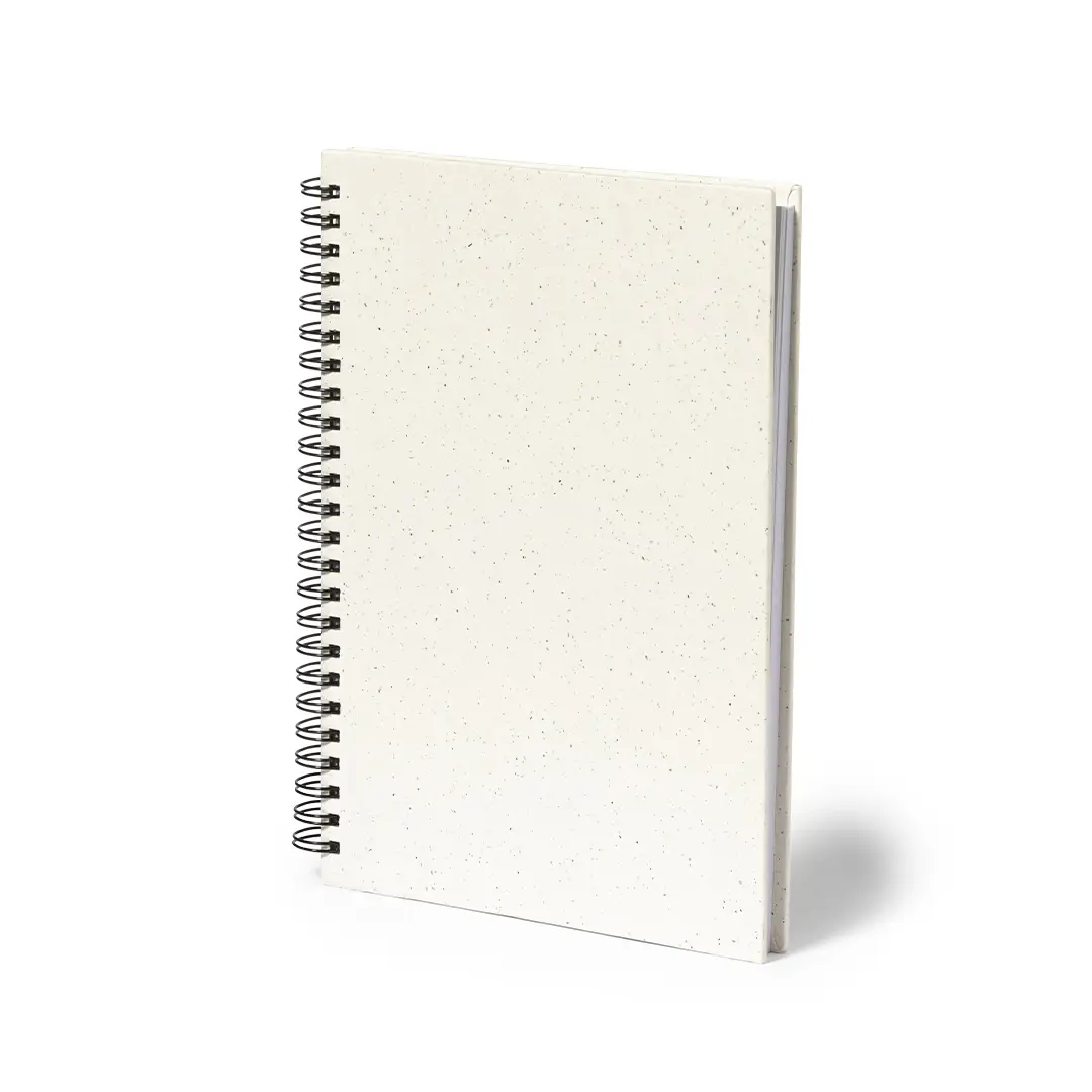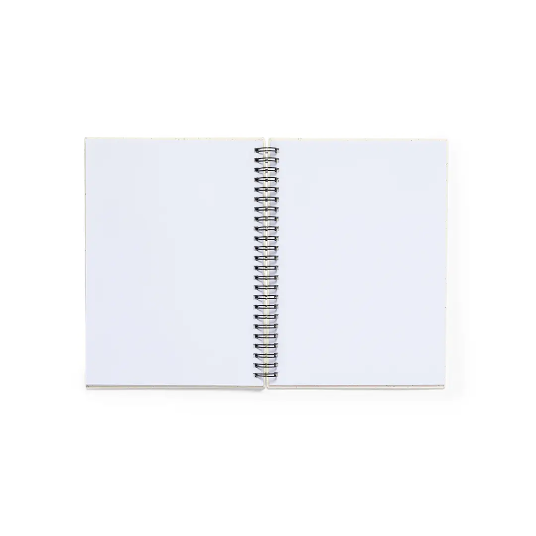 Libreta de anillas A5 con tapas duras en resistente cartón reciclado. Interior con 80 hojas blancas lisas y 100% recicladas microperforadas. Presentada en bolsa individual reciclada.