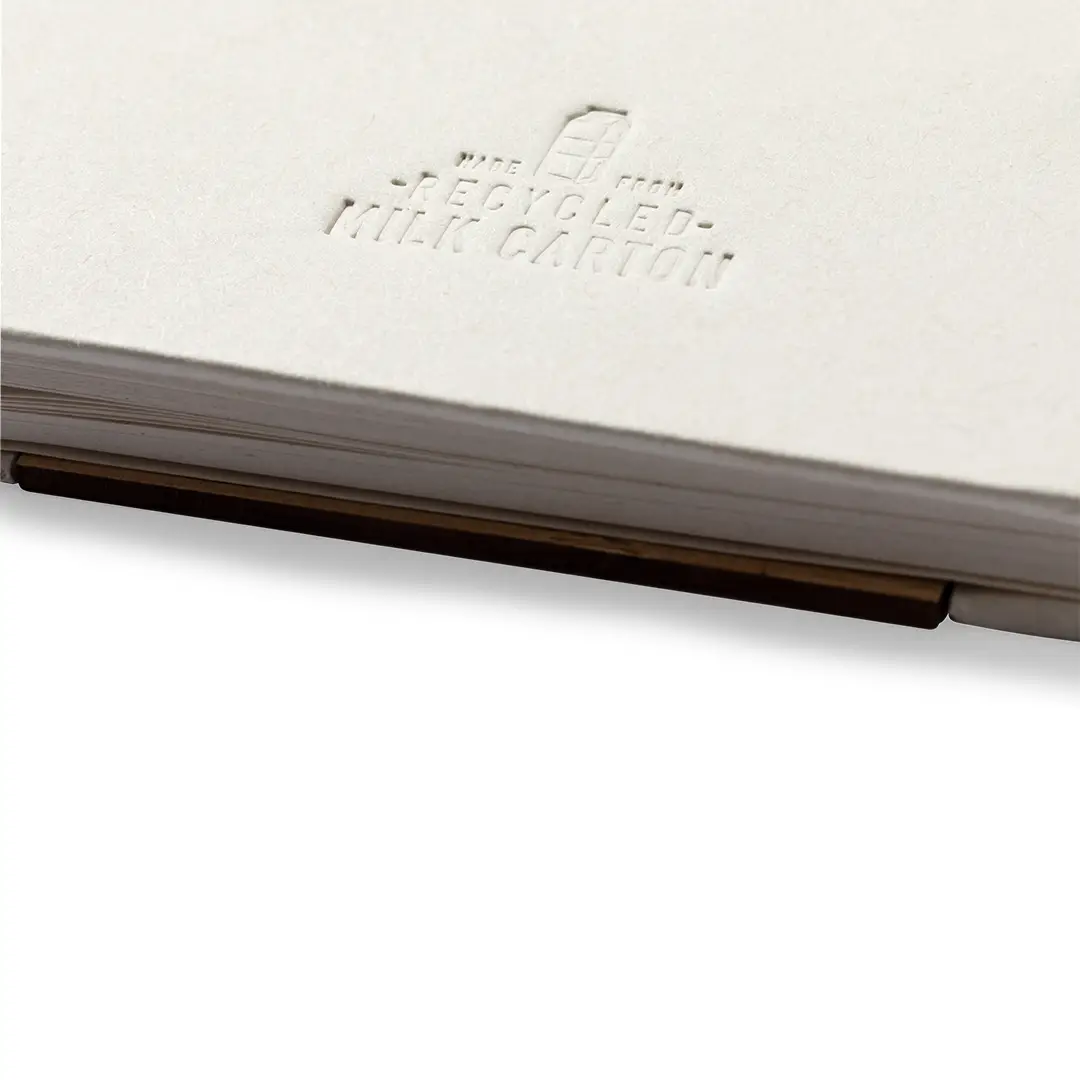 Libreta de tapas duras fabricada a partir de cartones de leche reciclados. Con 80 hojas de disposición a una raya, elástico de sujeción a juego y soporte para bolígrafo. Además, incluye bolígrafo fabricado a juego, con mecanismo pulsador y en tinta azul. Logotipo Recycled Milk Cartón en la esquina de las hojas, contraportada y bolígrafo. Presentada en bolsa individual reciclada.Los cartones de leche se componen en su mayor parte de cartón y aluminio. Durante su proceso de reciclado, se separan los distintos materiales del envase para su reutilización y nuevo uso, contribuyendo así a recorrer el camino infinito de la economía circular. Este material se caracteriza por su alto grado de reciclabilidad, así como por su ligereza y resistencia.