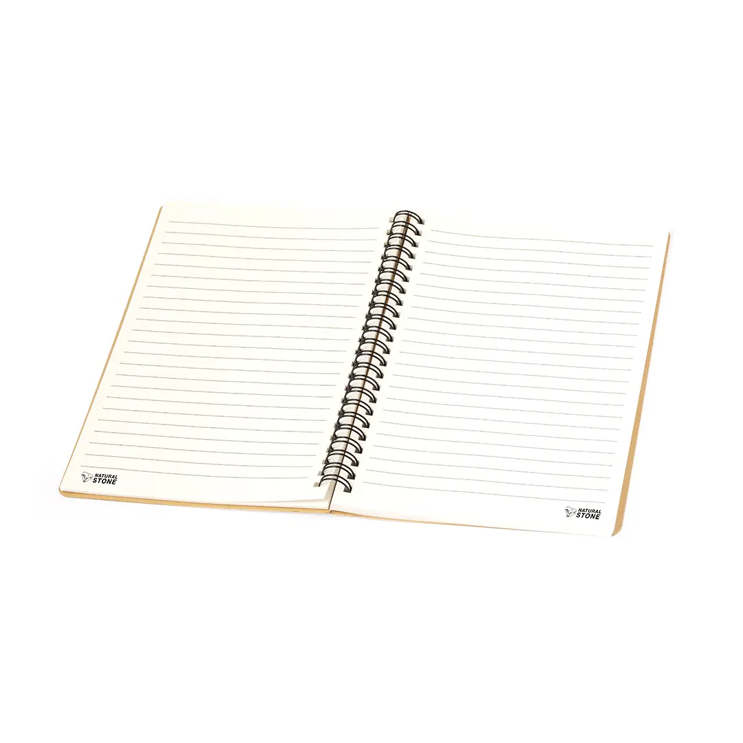 Libreta de anillas dobles metálicas con tapas blandas de cartón con hojas fabricadas a partir de extractos de piedra. Contiene 70 hojas color blanco y disposición a una raya, de elegante acabado de color natural. Logotipo Natural Stone en cada hoja. Incluye hoja interior en la que se explica el proceso de fabricación a partir de extractos de piedra.El material usado en la elaboración de la libreta es 100% reciclable y libre de cloro, con propiedades impermeables, altamente resistente y lavable, convirtiéndose así en una alternativa ecológica y sostenible frente al papel convencional, cuyo origen no es el tradicional ni proviene de los árboles.