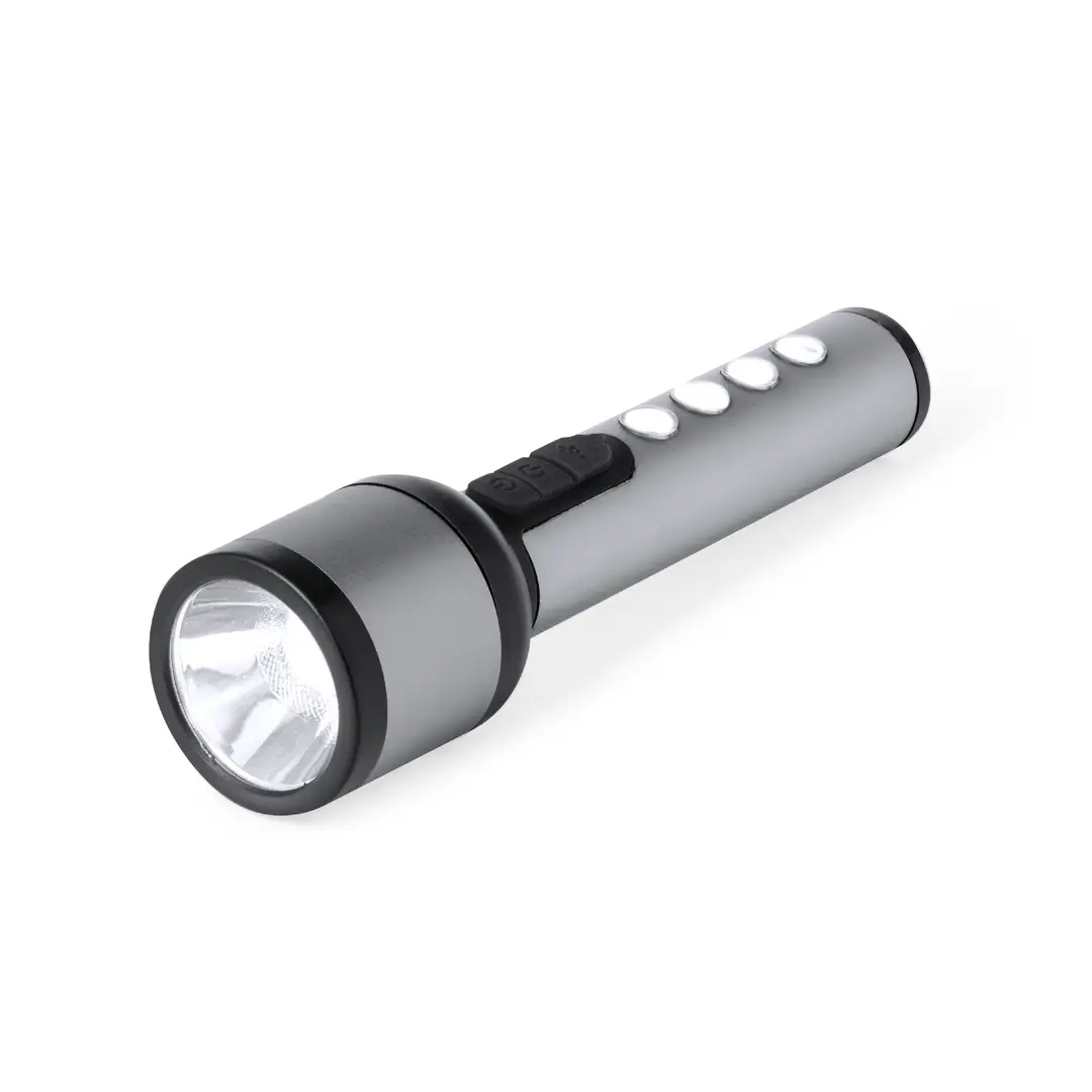 Linterna potente fabricada en aluminio con un diseño elegante en acabado gris metalizado con detalles en negro. Cuenta con 1 LED frontal para una iluminación focalizada y 4 luces COB en el mango para una dispersión más amplia de la luz. Ofrece 3 modos de iluminación: fija, intermitente lenta y rápida, adaptándose a diversas necesidades. Esta linterna es recargable mediante su batería de 1200 mAh, con el cable de carga incluido. Presentada individualmente en caja de diseño kraft.