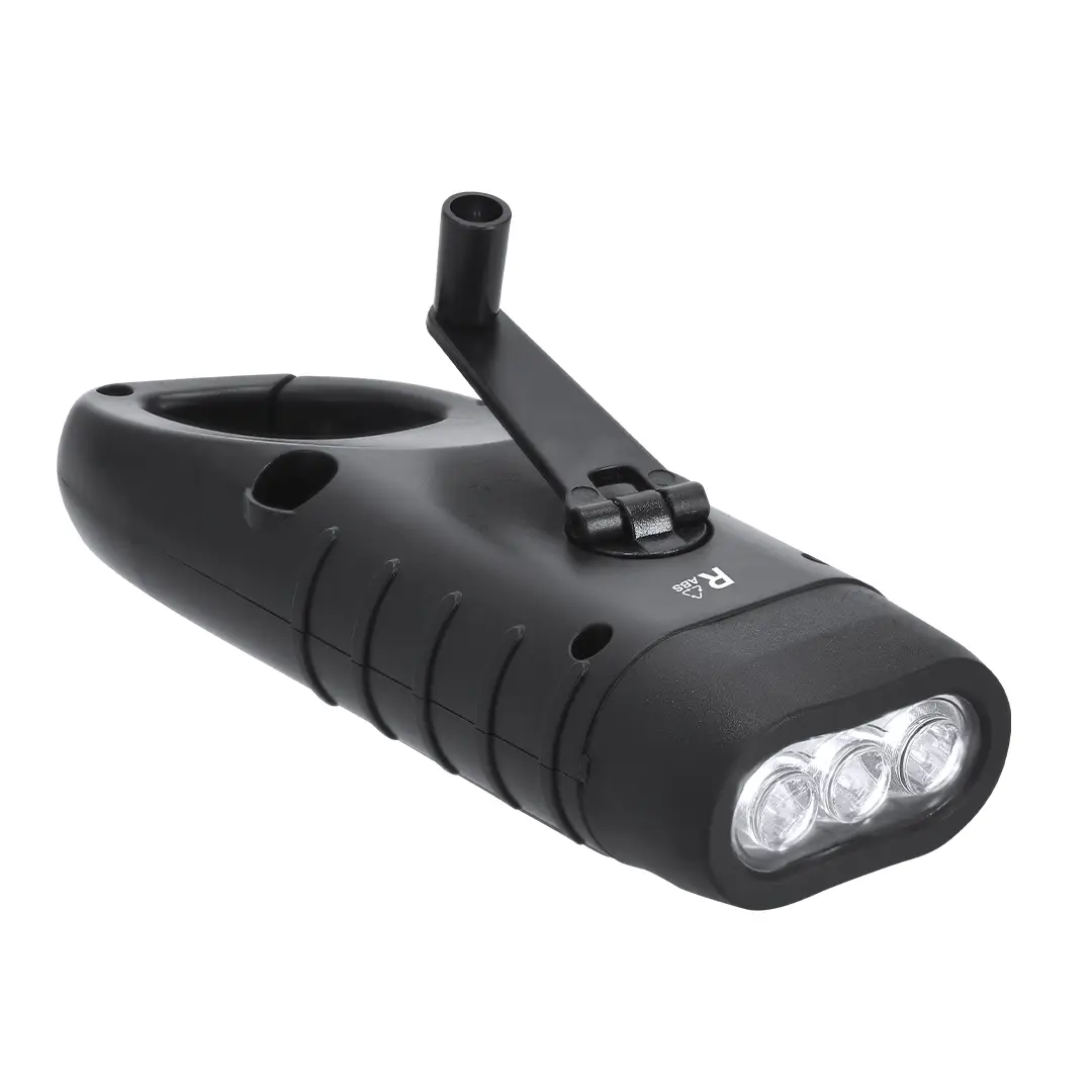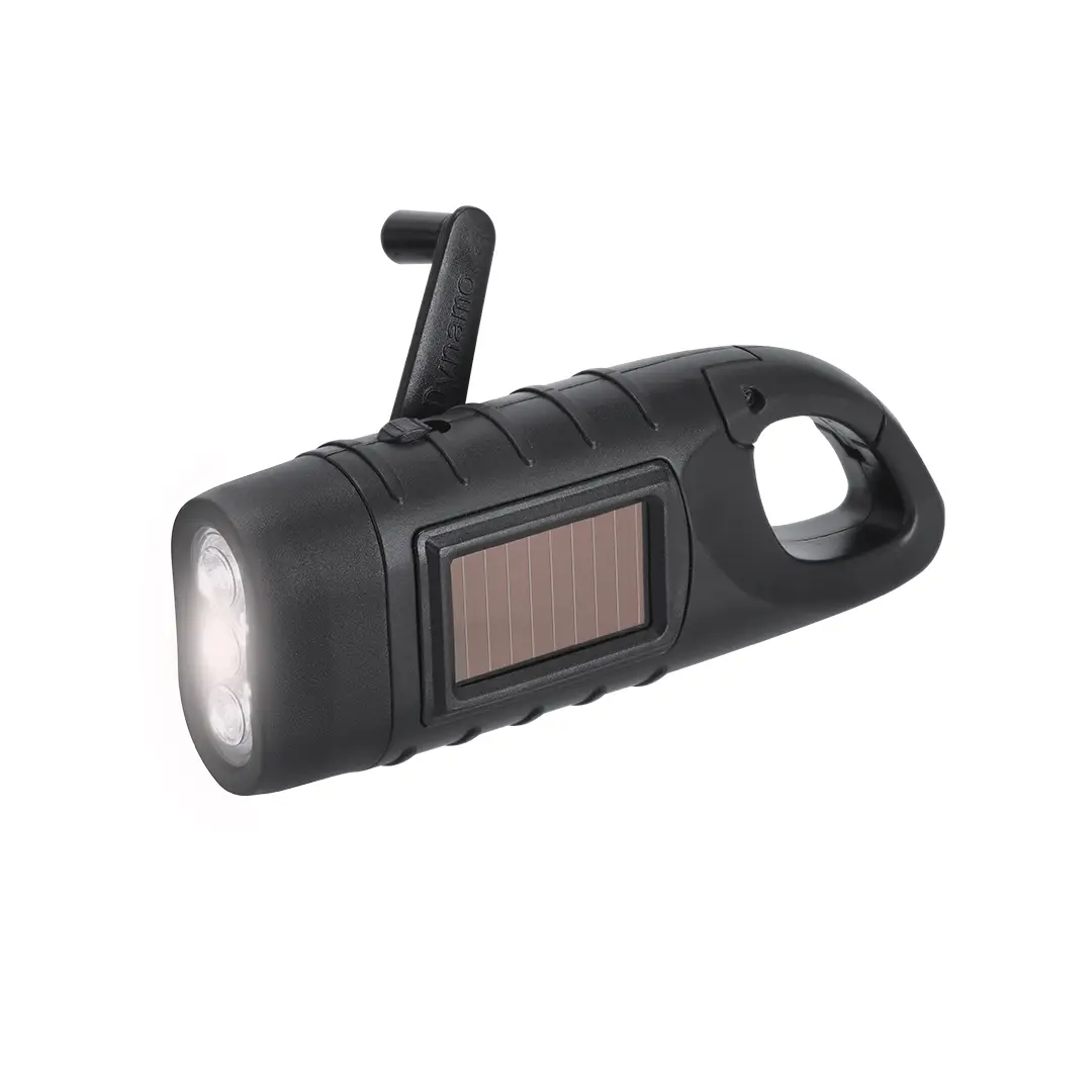 Linterna en ABS Reciclado con carga solar y carga manual con sistema dinamo ajustable de 360°. Dispone de 3 LEDs de luz blanca alimentada tanto por panel solar recargable como por 3 pilas de tipo botón de 40mAh. Incluye una funcional asa de agarre en forma de mosquetón pudiendo ser fácil de transportar. Una solución práctica para mantenerse siempre preparado.