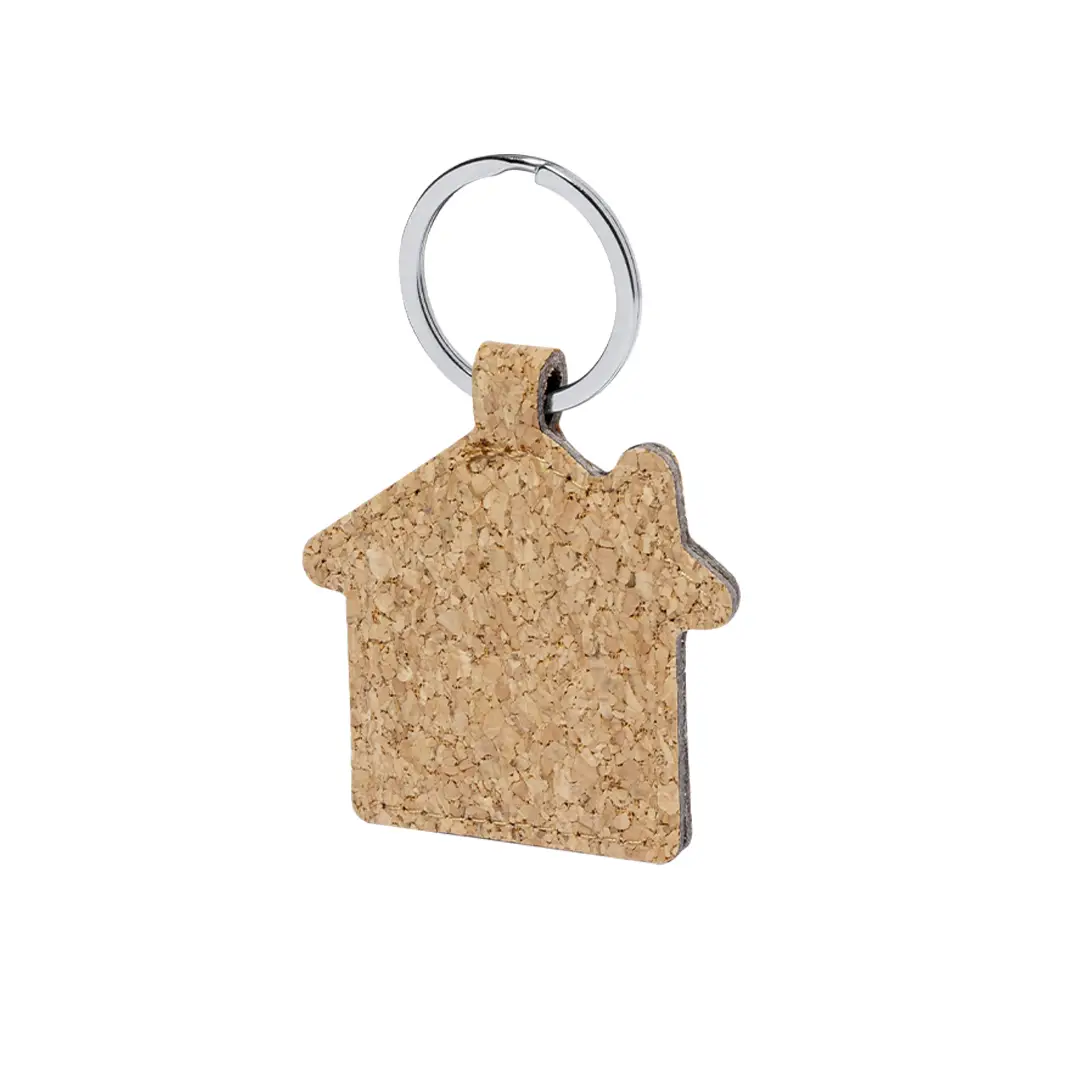 Llavero en forma de casa fabricado en corcho natural. Con amplia superficie de marcaje y presentado individualmente en bolsa reciclada. Elaborado con elementos vegetales para así fomentar la utilización de materias primas naturales y reducir las emisiones contaminantes.