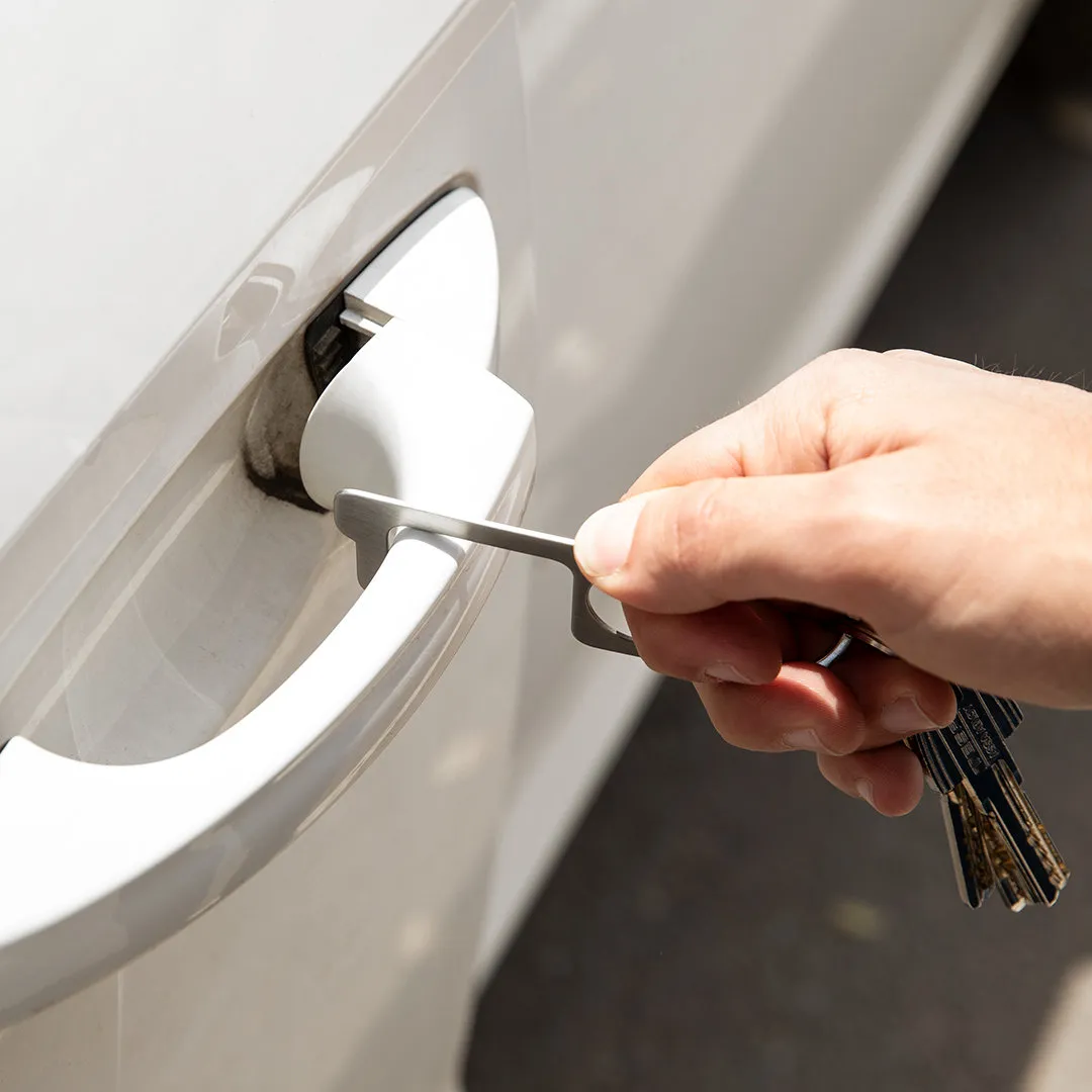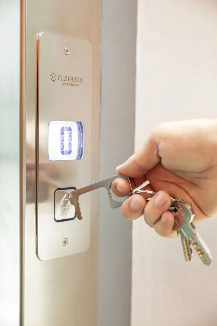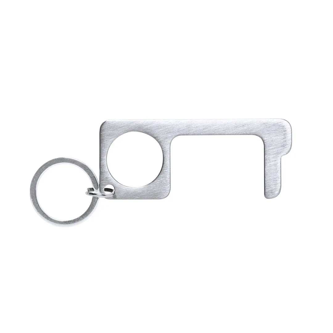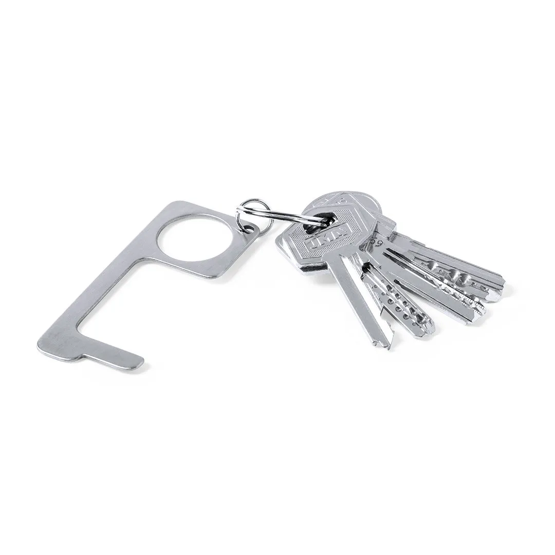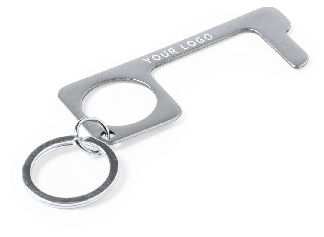 Llavero higiénico anti-contacto, fabricado en resistente acero inox. Especialmente diseñado para evitar tocar con las manos superficies de uso común (picaportes de puertas, interruptores, grifos de uso público, cajeros automáticos…). Con cómodo troquel para el dedo y presentado en bolsita individual. Recomendado para marcaje en láser.