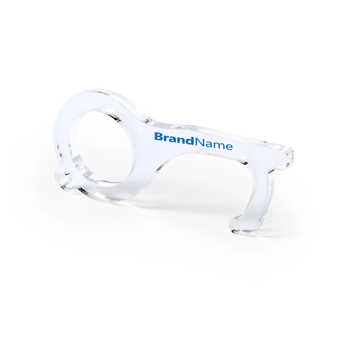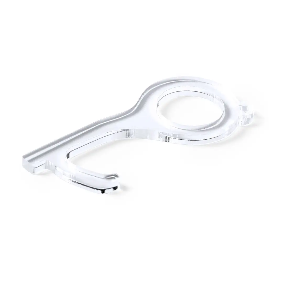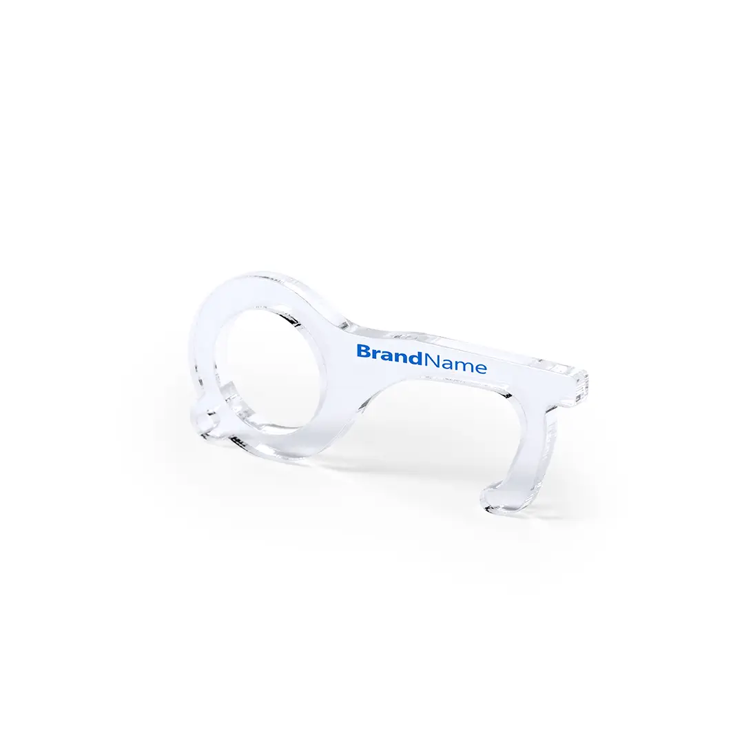 Llavero higiénico anti-contacto, fabricado en original y resistente material acrílico de acabado transparente. Especialmente diseñado para evitar tocar con las manos superficies de uso común (picaportes de puertas, interruptores, grifos de uso público, cajeros automáticos…). Con cómodo troquel para el dedo y presentado en bolsa individual de diseño. Recomendado para marcaje en tampografía.