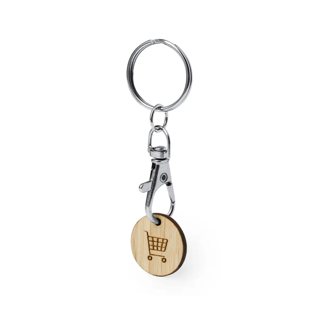 Llavero moneda fabricado en bambú. Con cierre de mosquetón giratorio y anilla para llaves. Incluye moneda fabricada en bambú con un grabado en forma del carro de la compra.Materiales como el bambú fomentan la utilización de materias primas naturales, reduciendo las emisiones contaminantes. Proviene de una planta de gran resistencia y versatilidad, con crecimiento y regeneración rápidos, siendo una excelente alternativa al uso de madera tradicional.