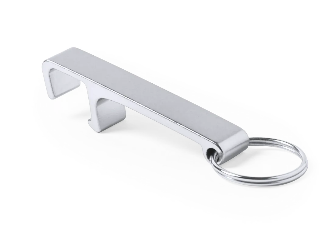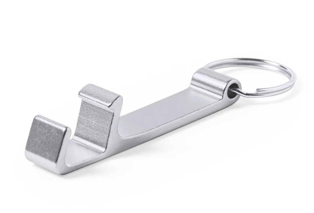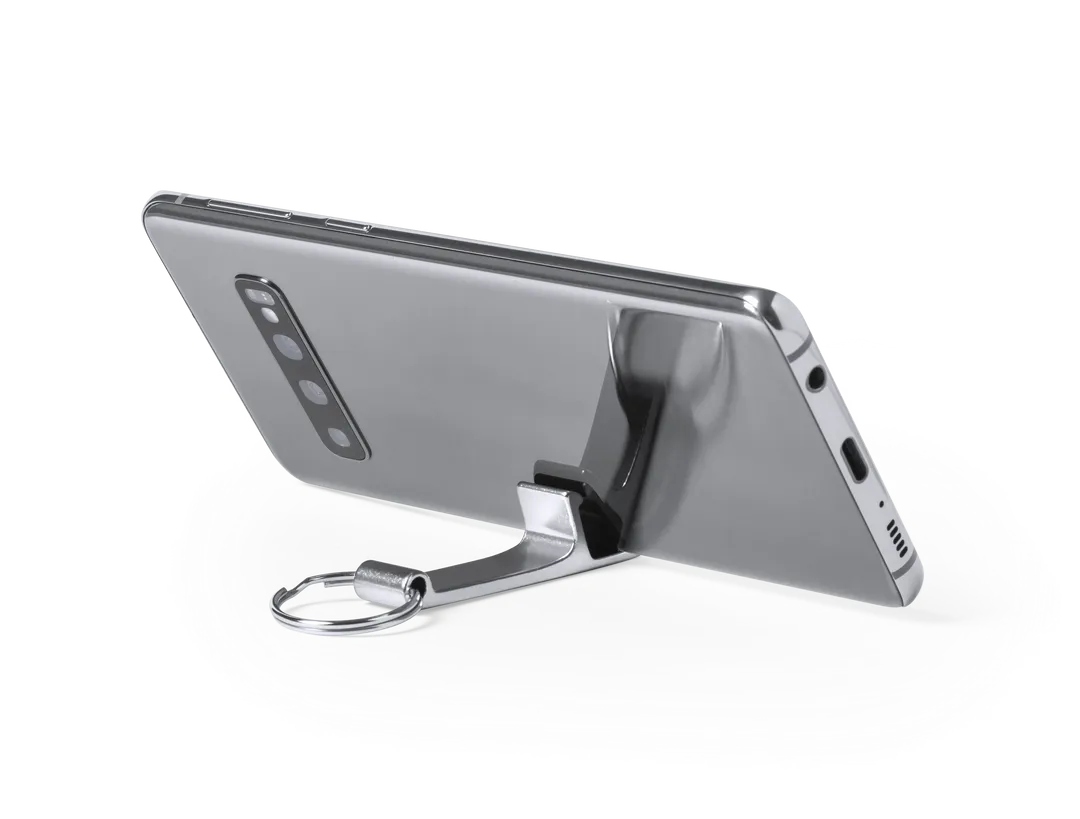 Llavero soporte para smartphone y tablet fabricado en aluminio de acabado mate, especialmente diseñado para marcaje en láser. Presentación individual en bolsita autocierre.
