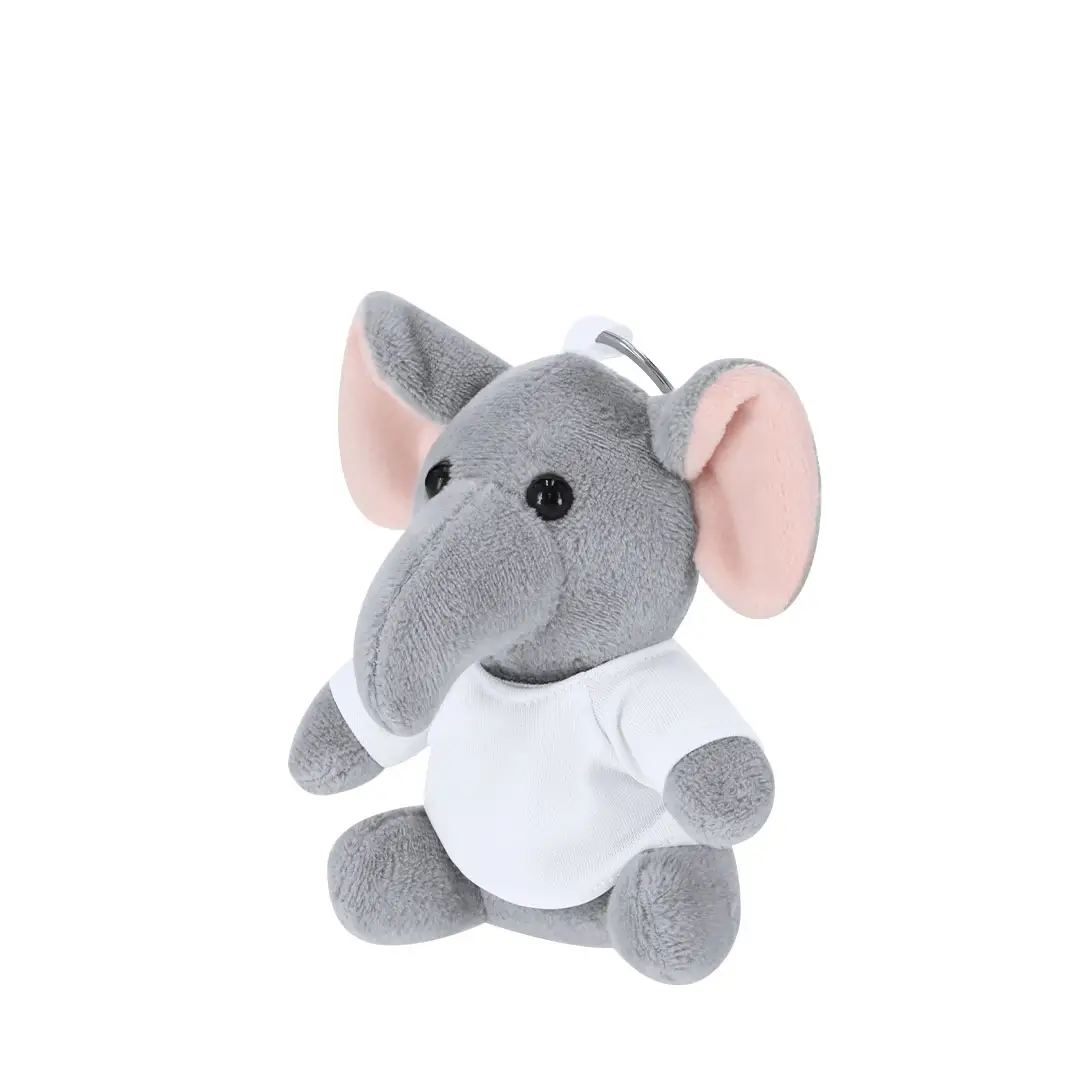 Llavero elefante de peluche con camiseta personalizable con anilla metálica para fácil transporte, ideal para sublimación.