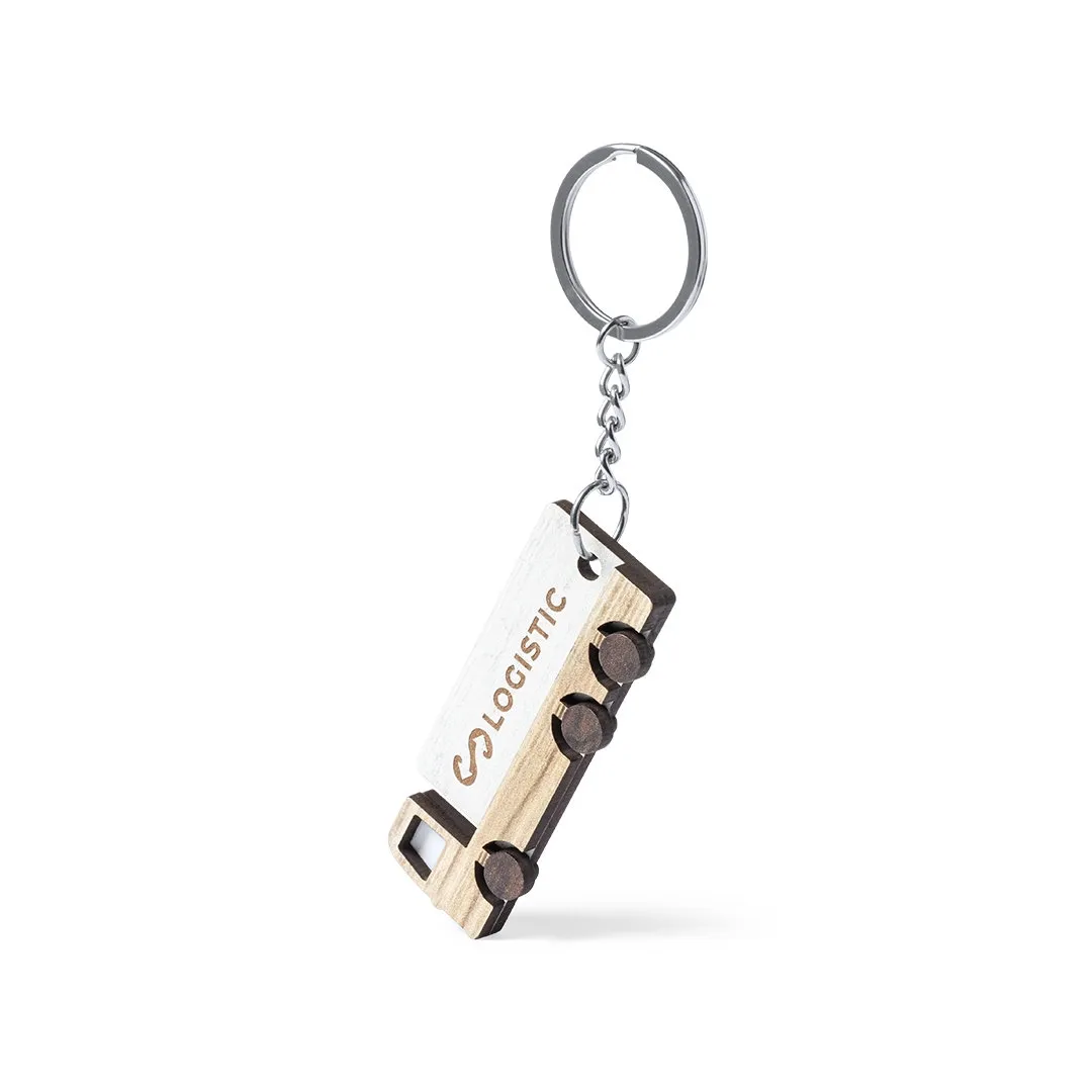 Llavero con diseño camión, fabricado en madera natural y de original acabado bicolor. Amplia superficie de marcaje, con anilla y cadena metálicas y distintivo Made In Europe.